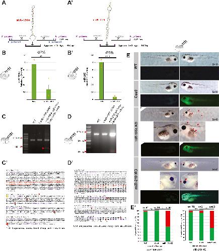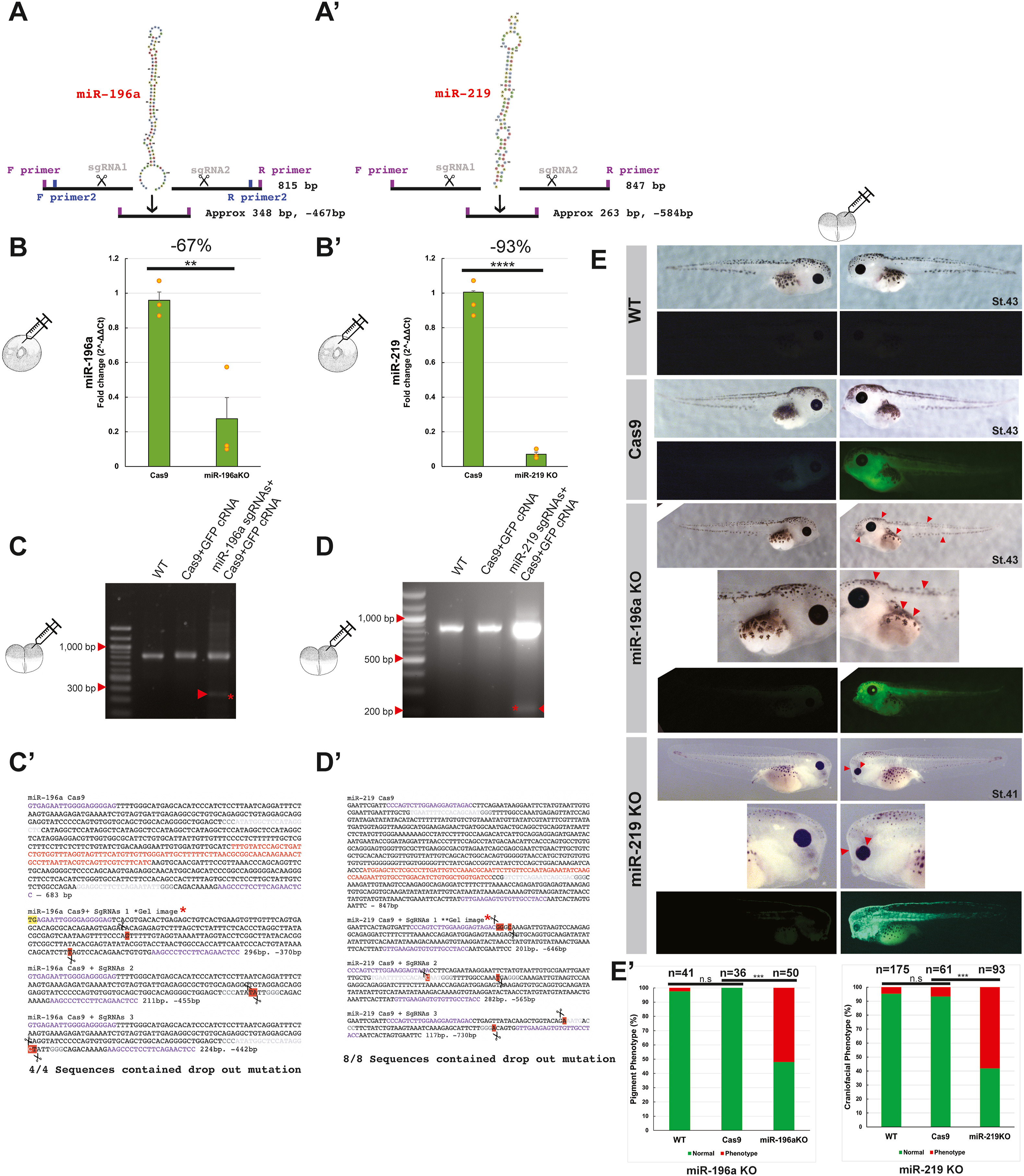 Fig. 2. CRISPR-Cas9 approach for knocking out miRNAs in X. tropicalis and validation strategies. (A-Aâ) Schematic showing the approach taken with use of two sgRNAs for miR-196a (A) and miR-219 (Aâ). (B) Q-RT-PCR validation of miR-KO, with individual data points from biological repeats shown in orange. MiR-196a KO showed a 67% reduction in expression (B), and miR-219 KO showed a 93% reduction in expression following CRISPR-Cas9 treatment (Bâ). Embryos were injected at the 1 âcell stage, bar charts show mean_+/â S.E.M. Experiments were conducted with biological and technical triplicate. (CâD) PCR/nested PCR validation of gDNA miRNA regions from embryos injected into one cell at 2 âcell stage of development, with KOs showing an extra smaller band in the fourth lane of each gel. (Câ-Dâ) Sanger sequencing validation of miRNA KOs and CRISPR events. Cas9+GFP control samples were also harvested, genomic DNA extracted, PCR amplified and subcloned. Purple text highlights primers used for cloning, red text shows miRNA stem-loop. Yellow highlight shows a mis-match, and red highlight with scissor icons show where CRISPR events occurred, grey text shows sgRNA. WT and Cas9 sequences show miRNA WT sequence, whereas Cas9+sgRNAs show 3 repeats of mutated sequences, with significantly shorter sequences. (E) Phenotype analysis of miRNA KO embryos, representative embryos are shown. Embryos were co-injected with CRISPR-reagents a GFP capped RNA tracer into one cell at a two cell stage of development. Embryos are imaged on left and right sides. WT had no injection, Cas9 protein was co-injected with GFP cRNA and miR-KO were pairs of sgRNAs, Cas9 protein and GFP cRNA tracer. The fluorescent side of miR-196a KO embryo red arrows indicate a pigment phenotype, and for miR-219 KO, the red arrows indicate a strong craniofacial phenotype, with smaller eyes, branchial arch and flattened face features. (Eâ) Bar charts show count data of yes/no phenotypes for miR-196a KO (pigment loss) and miR-219 KO (craniofacial disfigurement), with chi-squared tests for statistical significance. There was a significant difference between and Cas9 and miR-196a KO groups p â= â2.22 âà â10-7 and between Cas9 and miR-219 KO p â= â1.1 âà â10-10. Embryo phenotypes were blind counted on three biological repeats on embryos from different Xenopus parents.