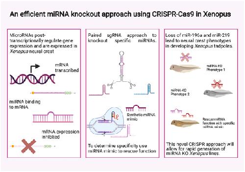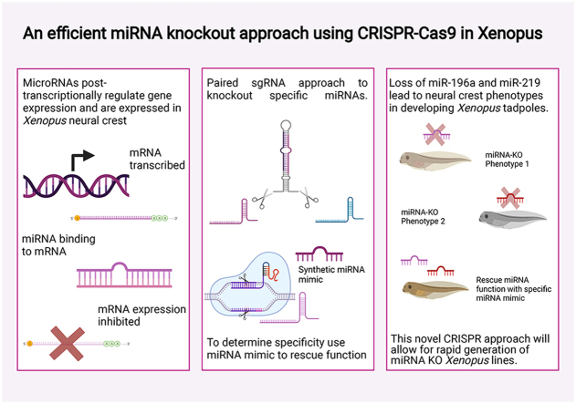In recent years CRISPR-Cas9 knockouts (KO) have become increasingly ultilised to study gene function. MicroRNAs (miRNAs) are short non-coding RNAs, 20-22 nucleotides long, which affect gene expression through post-transcriptional repression. We previously identified miRNAs-196a and -219 as implicated in the development of Xenopus neural crest (NC). The NC is a multipotent stem-cell population, specified during early neurulation. Following EMT, NC cells migrate to various points in the developing embryo where they give rise to a number of tissues including parts of the peripheral nervous system, pigment cells and craniofacial skeleton. Dysregulation of NC development results in many diseases grouped under the term neurocristopathies. As miRNAs are so small, it is difficult to design CRISPR sgRNAs that reproducibly lead to a KO. We have therefore designed a novel approach using two guide RNAs to effectively 'drop out' a miRNA. We have knocked out miR-196a and miR-219 and compared the results to morpholino knockdowns (KD) of the same miRNAs. Validation of efficient CRISPR miRNA KO and phenotype analysis included use of whole-mount in situ hybridization of key NC and neural plate border markers such as Pax3, Xhe2, Sox10 and Snail2, q-RT-PCR and Sanger sequencing. To show specificity we have also rescued the knockout phenotype using miRNA mimics. MiRNA-219 and miR-196a KO's both show loss of NC, altered neural plate and hatching gland phenotypes. Tadpoles show gross craniofacial and pigment phenotypes.
