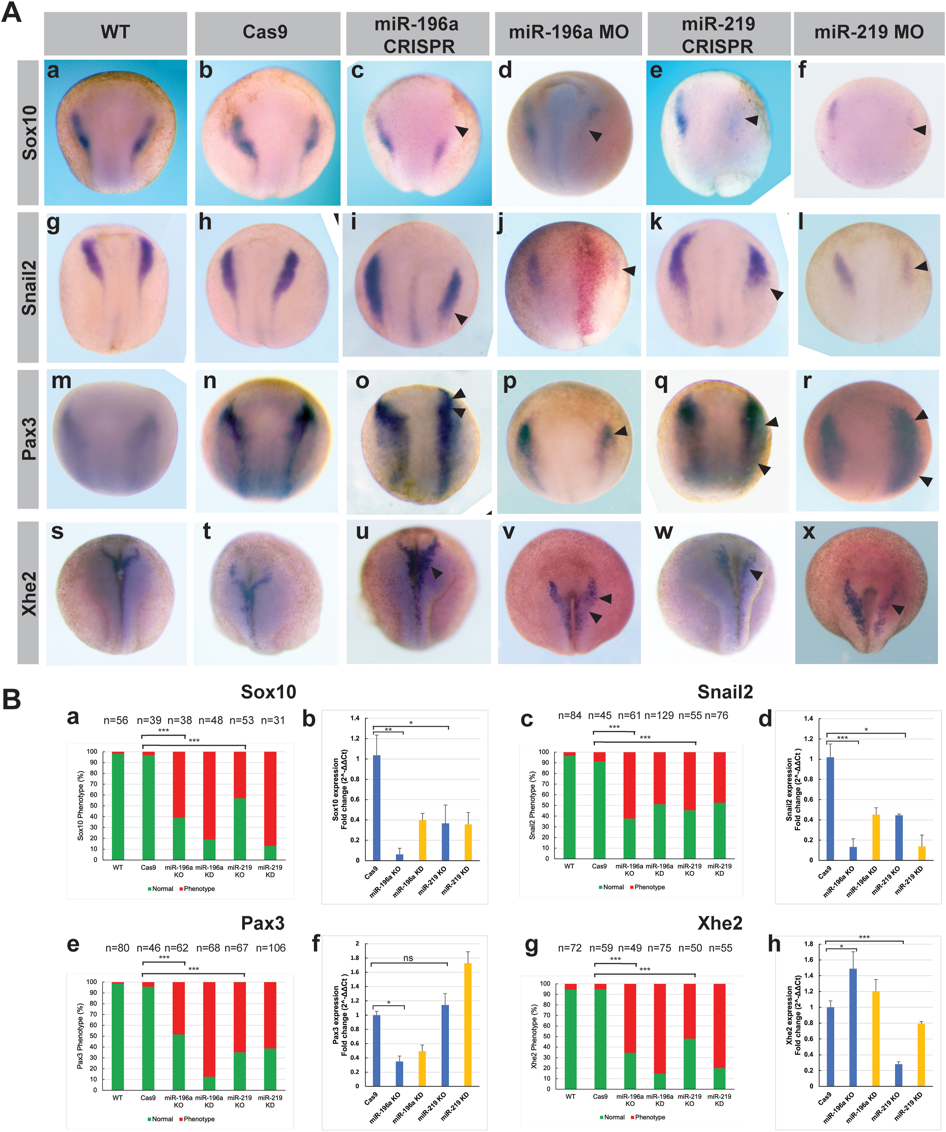 Fig. 3. Analysis of key NC, neural plate and hatching gland markers after miRNA KO and KD. (A) Whole mount in situ hybridisation profiles on neurula stage Xenopus embryos of Sox10, Snail2, Pax3 and Xhe2. CRISPR-Cas9 was carried out in X. tropicalis embryos with GFP cRNA as a tracer and morpholino-KD was carried out in X. laevis embryos with lacZ cRNA as a tracer. Embryos for whole mount in situ hybridisation were injected with tracer at 4-cell stage of development into the right dorsal blastomere. Panel A, a-f show Sox10 expression following CRISPR and MO experiments. Panel A g-l show Snail2 expression following CRISPR and MO experiments. Panel A m-r show Pax3 expression following CRISPR and MO experiments. Panel A, s-x shows Xhe2 expression following CRISPR and MO experiments. Overall phenotypes show a reduction of NC and altered neural plate and hatching gland profiles. (B) Phenotype analysis for individual markers. a, c, e and g show count data of yes/no phenotype prescence. Chi-squared statistical tests were carried out on three biological repeats of whole mount in situ hybridisation on embryos from different frogs. b, d f and h, Q-RT-PCR results of mRNA expression analysis following CRISPR KO and MO KD. Normalised to U6 expression, RNA was pooled from 5 individual neurula embryos for one biological sample, Q-RT-PCR was carried out with biological and technical triplicates. The Q-RT-PCR data supports phenotypes shown in (A). Panel B, a-b show Sox10 expression following CRISPR KO and MO KD. Panel B, c-d show Snail2 expression following CRISPR KO and MO KD. Panel B, e-f show Pax3 expression following CRISPR KO and MO KD. Panel B, g-h show Xhe2 expression following CRISPR KO and MO KD experiments. Panel B, a,c,e and g show phenotype count data. Panel B, b,d,f and h show q-RT-PCR expression of mRNAs following miRNA KO and KD. Abbreviations for phenotype and q-RT-PCR bar charts in (B): miR-KO refers to CRISPR miRNA KO and miR-KD refers to MO KD of miRNA. Phenotypes for miRNA KD/KO: Sox10 phenotype is a reduction in expression, Snail2 is a reduction/shift in profile, Pax3 phenotype is a shift/reduced profile for miR-196a and an expansion for miR-219 experiments, finally, Xhe2 is an increased profile for miR-196a and a reduced profile for miR-219 experiments respectively. Statistical significance: Sox10 Cas9 vs miR-196a KO p â= â4.02 âà â10-8, Cas9 vs miR-219 KO p â= â1.04 âà â10-5, Snail2 Cas9 vs miR-196a KO p â= â6.15 âà â10-9, Cas9 vs miR-219 KO p â= â4.07 âà â10-7, Pax3 Cas9 vs miR-196a KO p â= â7.19 âà â10-7, Cas9 vs miR-219 KO p â= â2.29 âà â10-8, Xhe2 Cas9 vs miR-196a KO p â= â7.19 âà â10-7, Cas9 vs miR-219 KO p â= â2.29 âà â10-8.