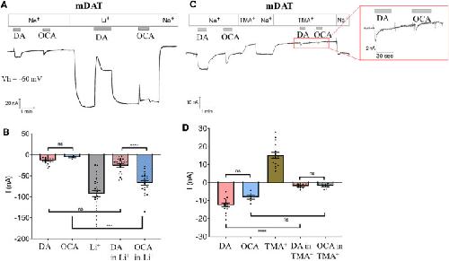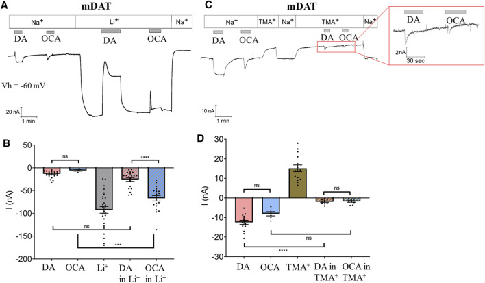 p < 0.0001). (C) Representative trace from oocytes expressing mDAT perfused with 30 µM DA or 10 µM OCA in ND98 or TMA98 buffer. (D) Mean of maximal currents under conditions shown in C (I nA ± SE of 6–15 oocytes, 3 batches. One-way ANOVA F(4,51) = 86.94, p < 0.0001 followed by Bonferroni’s multiple comparison test (DA vs OCA p = 0.359, DA vs DA in TMA+