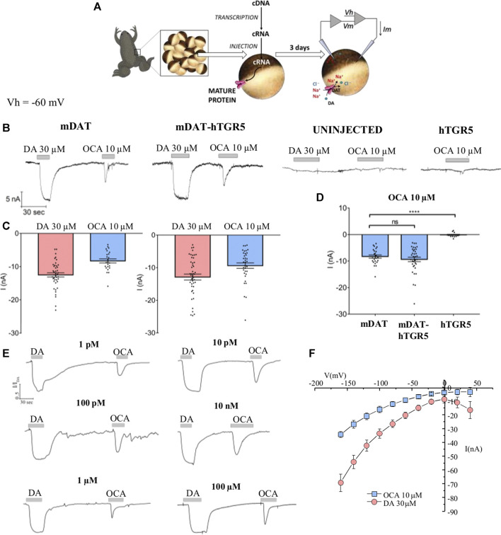 FIGURE 1. OCA generates an electrical current through the DAT. (A) Schematic representation of oocyte collection, cRNA synthesis and injection, and TEVC technique. (B) Representative traces of currents recorded by TEVC (Vh = −60 mV) from oocytes expressing mDAT, without or with hTGR5, uninjected, or expressing hTGR5 alone. The oocytes were perfused with 30 µM DA or 10 µM OCA. (C) Mean of the maximal DA-associated and OCA-induced currents (I nA ± SE of 14–47 oocytes, 6–11 batches) in oocytes expressing mDAT (C, left) or mDAT plus TGR5 (C, right). (D) Mean of the maximal OCA-induced currents in oocytes expressing the proteins indicated; one-way ANOVA F(2,74) = 36.13, p < 0.0001 followed by Tukey’s multiple comparison test (mDAT vs mDAT-hTGR5 p = 0.566, mDAT vs hTGR5 p < 0.0001). (E) Representative traces of currents recorded by TEVC (Vh = −60 mV) from oocytes tested with DA (30 µM) and OCA at the indicated concentrations. The current of each trace was normalized to the mean current of dopamine to reduce the variability between batches. (F) I/V relationships of DA (30 µM) and OCA (10 µM)-induced currents.