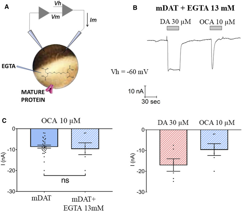 FIGURE 3. Intracellular calcium does not regulate OCA-induced currents. (A) Schematic representation of the EGTA injection technique. (B) Representative trace of current recorded by TEVC (Vh = −60 mV) in oocytes expressing mDAT and injected with 13 mM EGTA in intracellular solution 30 min before exposure to 30 µM DA or 10 µM OCA in ND98 buffer (top) and the mean of maximal transport-associated and OCA-induced currents (bottom) (I nA ± SE of 6–7 oocytes, 2 batches). (C) Mean of maximal OCA-induced currents in mDAT oocytes with or without injection of EGTA. Two-tailed Student’s t-test, p = 0.476.