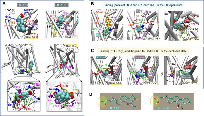 FIGURE 6. OCA binding to DAT depends on its protonation state and on DAT conformation. (A) Binding of negatively charged (left) and neutral (right) OCA (cyan) to hDAT in the OFo