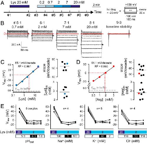 Fig. 2. PQLC2 is a cationic amino acid uniporter. (A) Protocol used for reversal potential measurements. After accumulating Lys through PQLC2, the oocyte is equilibrated with varying Lysout concentrations and subjected to voltage jumps. (B) Representative Lys-evoked current traces, obtained by subtracting the raw currents recorded at the numbered tick marks on the time’s arrow in A. (C) Lysout dependence of Vrev for the oocyte shown in B (blue dots) and five other PQLC2 oocytes. Vrev is proportional to log([Lys]out) with a mean slope 52 ± 2 mV/decade, consistent with the translocation of one elementary charge per Lys molecule. The internal Lys concentration is deduced from this relationship (red dotted line). The value of Vrev at the end of the Lys-loading phase (open purple dot) shows that a constant [Lys]in was maintained throughout the experiment. (D) Vrev measurements obtained with Arg as substrate. (E) Vrev is not affected by 10- to 100-fold changes in the external concentrations of H+, Na+, K+, and Cl−.