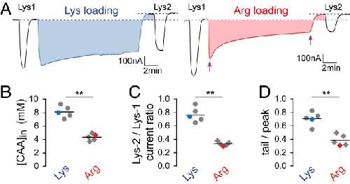 Fig. 4. Argin selectively reduces the inward current. Naive PQLC2 oocytes were perfused with a brief pulse of 20 mM Lys before and after sustained loading with 20 mM Lys or Arg at −60 mV. (A) Representative current traces. (B) Internal amino acid levels determined from the time integral of the loading currents based on an oocyte volume of 0.5 µL. (C) Ratio between the two pulse currents. (D) Current decrease during the loading step (arrows in A). The colored dots correspond to the oocytes shown in A. **P < 0.01.