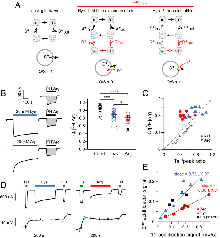 Fig. 5. Arginine transinhibits PQLC2. (A) Potential mechanisms for the Arg effect. The exchange and trans-inhibition mechanisms differentially alter the charge–substrate ratio (Q/S) of the transport cycle. (B) Charge–substrate ratio measurements in PQLC2 oocytes preloaded, or not, for ≥8 min at −60 mV with 20 mM Lys or Arg. Representative traces and mean ratio values for 6 to 11 oocytes per condition. *P = 0.025; ***P ≤ 0.001; ****P ≤ 10−5. (C) The charge–substrate ratio is plotted against the PQLC2 current decrease during the loading step. (D) PQLC2 oocytes perfused with a brief pulse of His before and after sustained loading with either Lys or Arg were recorded with an intracellular H+-selective electrode under voltage clamp. Representative current (Top) and pH electrode (Bottom) traces. The green dotted lines highlight the decreased acidification rate after Arg loading. (E) Relationship between the His-evoked acidification before and after Lys or Arg loading. The results are compared to those of PQLC2 oocytes without intervening loading steps (black squares).