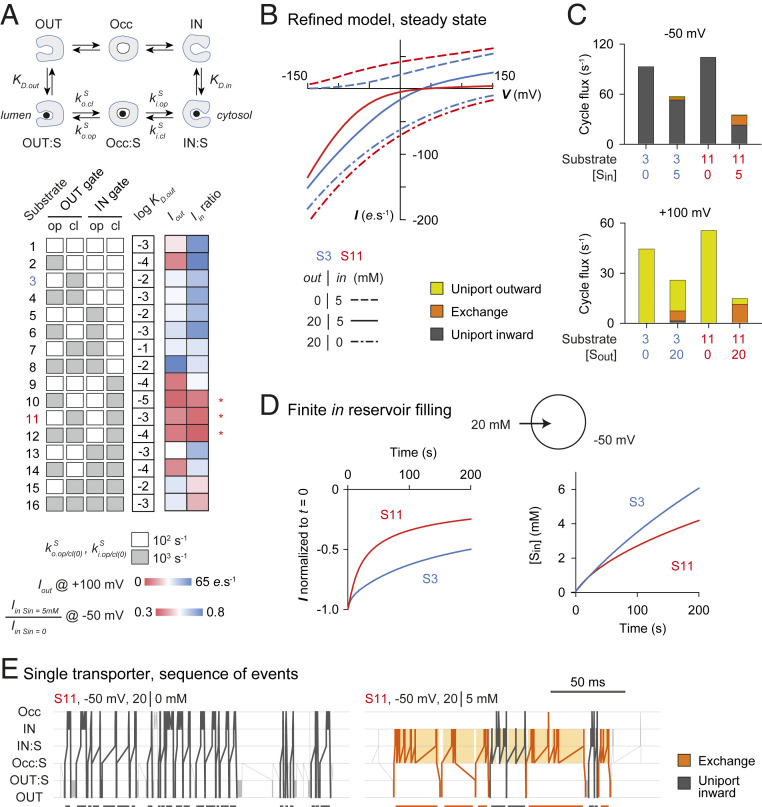 Fig. 6. Modulation of the transporter cytosolic gate by the bound substrate recapitulates the Arg-specific properties. (A) Systematic survey of substrate-specific parameters in a kinetic model of electrogenic uniporter. Gating constants of the loaded transporter (lower arm of the six-state scheme) were systematically varied in a binary manner. The substrate luminal affinity (KD.out) was adjusted accordingly to meet the microscopic reversibility principle. I–V curves were simulated for the 16 resulting substrates at 20 and 5 mM luminal and cytosolic concentrations, respectively. The heat map shows the intensity of the outward current at +100 mV and the decrease of the inward current by the inner substrate at −50 mV. Substrates 3 and 11 were selected to mimic the Lys-like and Arg-like behaviors, respectively. (B) I–V curves of the S3 and S11 currents in a refined uniporter model for the indicated conditions. (C) Uniport and exchange cycling frequencies underlying the currents in B are shown at −50 mV and +100 mV. (D) The model was tested in simulations of a finite reservoir (1 µL) at −50 mV with 5 × 108 transporters. (E) Representative single-transporter trajectories with S11 corresponding to the times 0 (Left) and 270 s (Right) in the reservoir-filling simulations.
