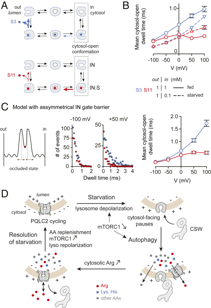 Fig. 7. Lysosomal depolarization and the Arg-like substrate S11 antagonistically control the cytosol-facing conformation. (A) Kinetic differences induced by substrates 3 and 11 in the uniporter model. (B) The voltage dependence of the dwell time in cytosol-facing conformation was determined from single-transporter simulations in conditions mimicking nutrient replete and starved conditions (cytosolic substrate at 1 and 0.1 mM, respectively). Mean ± SEM of five 200-ms simulations, representing 100 to 750 events per condition. (C) Single-transporter simulations were repeated for a uniporter with an asymmetrical energy barrier of the cytosolic gate and otherwise identical model parameters. Dwell time distributions at two potentials and voltage dependence of the mean dwell time in cytosol-facing conformation (60 to 700 events per condition). (D) Putative model for the regulation of the interaction between PQLC2 and the CSW complex by the nutrient status. Lysosomal depolarization and cytosolic Arg may antagonistically control this interaction by increasing and shortening the duration of PQLC2 pauses in cytosol-facing conformation.