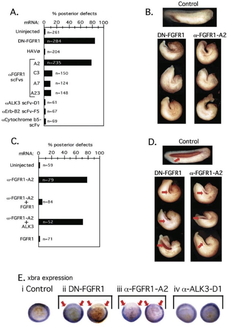 We evaluated the use of single-chain antibody (scFv) expression as a tool to disrupt the function of specific proteins in embryos of the frog, Xenopus laevis. The expression of scFvs that recognize the bone morphogenetic protein receptor (ALK3) or the fibroblast growth factor receptor1 (FGFR1) as endoplasmic reticulum-anchored proteins caused distinct developmental defects that were virtually indistinguishable from the defects caused by expression of the dominant negative forms of each receptor. These results demonstrate that scFvs from phage-display libraries can be readily fashioned into effective and specific inhibitors of signaling pathways in developing embryos. In addition, as several effective scFvs against a specific target can be isolated rapidly, this approach represents a valuable new tool for large-scale functional analysis of the embryonic proteome.