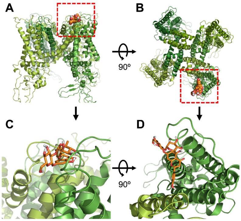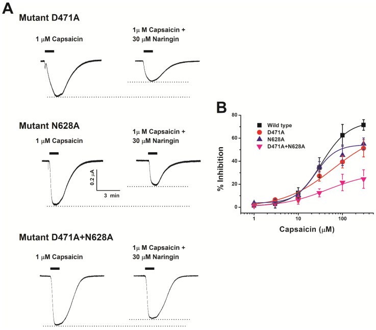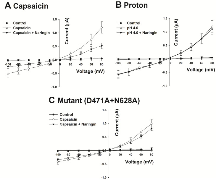 Transient receptor potential vanilloid member 1 (TRPV1) is activated in response to capsaicin, protons, temperature, and free reactive oxygen species (ROS) released from inflammatory molecules after exposure to harmful stimuli. The expression level of TRPV1 is elevated in the dorsal root ganglion, and its activation through capsaicin and ROS mediates neuropathic pain in mice. Its expression is high in peripheral and central nervous systems. Although pain is a response evolved for survival, many studies have been conducted to develop analgesics, but no clear results have been reported. Here, we found that naringin selectively inhibited capsaicin-stimulated inward currents in Xenopus oocytes using a two-electrode voltage clamp. The results of this study showed that naringin has an IC50 value of 33.3 μM on TRPV1. The amino acid residues D471 and N628 of TRPV1 were involved in its binding to naringin. Our study bridged the gap between the pain suppression effect of TRPV1 and the preventive effect of naringin on neuropathic pain and oxidation. Naringin had the same characteristics as a model selective antagonist, which is claimed to be ideal for the development of analgesics targeting TRPV1. Thus, this study suggests the applicability of naringin as a novel analgesic candidate through antioxidative and analgesic effects of naringin.