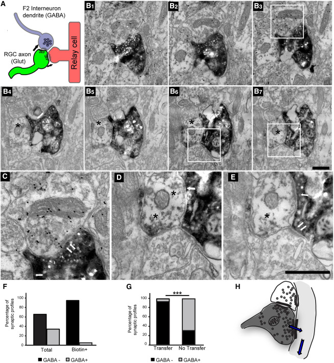 Intercellular transfer of toxic proteins between neurons is thought to contribute to neurodegenerative disease, but whether direct interneuronal protein transfer occurs in the healthy brain is not clear. To assess the prevalence and identity of transferred proteins and the cellular specificity of transfer, we biotinylated retinal ganglion cell proteins in vivo and examined biotinylated proteins transported through the rodent visual circuit using microscopy, biochemistry, and mass spectrometry. Electron microscopy demonstrated preferential transfer of biotinylated proteins from retinogeniculate inputs to excitatory lateral geniculate nucleus (LGN) neurons compared with GABAergic neurons. An unbiased mass spectrometry-based screen identified ∼200 transneuronally transported proteins (TNTPs) isolated from the visual cortex. The majority of TNTPs are present in neuronal exosomes, and virally expressed TNTPs, including tau and β-synuclein, were detected in isolated exosomes and postsynaptic neurons. Our data demonstrate transfer of diverse endogenous proteins between neurons in the healthy intact brain and suggest that TNTP transport may be mediated by exosomes.