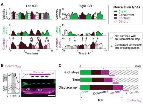 Figure S4. Classification of intercalation steps. Related to Figure 2 and Movie S2, S3. (A) Representative intercalation step analysis for the tCRs in Figure 1I-M. For each tCR, the intercalation velocity, crawling signal, and contraction signal were plotted verses time. Peaks and valleys were detected using customized scripts and individual peaks were separated with dashed lines at the adjacent valleys. An intercalation step was defined as an individual peak on the velocity trace and was classified based on its cross-correlation with pulses on the crawling and/or contraction signals. The correlated peaks were color-coded as indicated. Intercalation steps that had no cross-correlation with crawling nor contraction pulses were filled with diagonal strips, while contraction and crawling pulses that had no cross-correlation with any intercalation step were filled with dots. Brown arrows label correlated contraction and crawling pulses. Brown double-line arrows mark correlated crawling and contraction pulses that are associated with different velocity peaks. Daggers mark crawling and contraction pulses that were correlated successively. Lag-time window for all cross-correlation analysis was 40 sec, and the threshold for cross- correlation coefficient was 0.5. (B) Examples showing an intercalation step correlated with a contraction pulse from the middle region of an AP interface, and not correlated with actin dynamics in the tCR. See Movie S3. (C) Figure 2F replotted in which Mid contraction (“ContractMid”) was also considered. The majority of cell intercalation is attributed to actin dynamics at tCRs and therefore the Mid contraction was neglected in this study. |