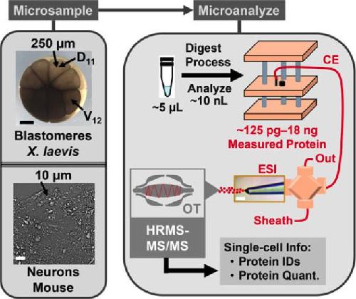 Understanding the biochemistry of the cell requires measurement of all the molecules it produces. Single-cell proteomics recently became possible through advances in microanalytical sample preparation, separation by nano-flow liquid chromatography (nanoLC) and capillary electrophoresis (CE), and detection using electrospray ionization (ESI) high-resolution mass spectrometry (HRMS). Here, we demonstrate capillary microsampling CE-ESI-HRMS to be scalable to proteomics across broad cellular dimensions. This study established proof-of-principle using giant, ∼250-µm-diameter cells from embryos of the frog Xenopus laevis and small, ∼35-µm-diameter neurons in culture from the mouse hippocampus. From ∼18 ng, or ∼0.2% of the total cellular proteome, subcellular analysis of the ventral-animal midline (V11) and equatorial (V12) cells identified 1,133 different proteins in a 16-cell embryo. CE-HRMS achieved ∼20-times higher sensitivity and doubled the speed of instrumental measurements compared to nanoLC, the closest neighboring single-cell technology of choice. Microanalysis was scalable to 722 proteins groups from ∼5 ng of cellular protein digest from identified left dorsal-animal midline cell (D11), supporting sensitivity for smaller cells. Capillary microsampling enabled the isolation and transfer of individual neurons from the culture, identifying 37 proteins between three different cells. A total of 224 proteins were detected from 500 pg of neuronal protein digest, which estimates to a single neuron. Serial dilution returned 157 proteins from sample amounts estimating to about half a cell (250 pg protein) and 70 proteins from ca. a quarter of a neuron (125 pg protein), suggesting sufficient sensitivity for subcellular proteomics. CE-ESI-HRMS complements nanoLC proteomics with scalability, sensitivity, and speed across broad cellular dimensions.