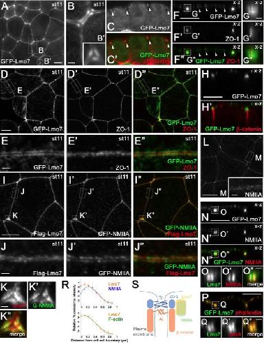 Ooshio, Involvement of LMO7 in the association of two cell-cell adhesion molecules, nectin and E-cadherin, through afadin and alpha-actinin in epithelial cells. 2004, Pubmed