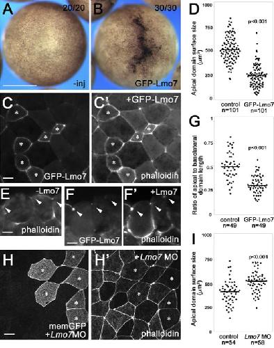 Figure 2. Lmo7 induces apical constriction in Xenopus ectoderm. (A,B) GFP-Lmo7 RNA (1â ng) was injected into two animal blastomeres of four- to eight-cell stage embryos. (A) Control uninjected embryo at stage 11. (B) Embryo expressing GFP-Lmo7 at stage 11 exhibiting apical pigment granule accumulation. (C,Câ²) Reduced apical domain in cells expressing GFP-Lmo7 (200â pg RNA) in stage 11 embryos. En face view of the ectoderm co-stained with phalloidin. Asterisks indicate GFP-Lmo7-expressing cells. (D) Quantification of apical domain surface size in cells expressing GFP-Lmo7 (n=101) and adjacent control cells (n=101). Images were taken from at least five embryos. (E-Fâ²) Cross-sections of the ectoderm in stage 11 embryos expressing GFP-Lmo7 RNA (200â pg). Embryos were co-stained with phalloidin. Arrowheads indicate GFP-Lmo7 or F-actin accumulation at the most apical region of the basolateral membrane. (G) The ratio of the apical to the basolateral domain length in the cells expressing GFP-Lmo7 (n=49) and uninjected control cells (n=49). (H,Hâ²) Increased apical domain in Lmo7-ATGMO cells. Lmo7-ATGMO (30â ng) was co-injected with membrane-tethered RNA (100â pg). The ectoderm from stage 11 embryos was co-stained with phalloidin, en face view. Asterisks indicate Lmo7-ATGMO-containing cells. (I) Quantification of apical domain size in Lmo7-ATGMO cells (n=58) and adjacent control cells (n=54). Images were taken from at least five embryos. Statistical significance of the difference between the median values was assessed by the MannâWhitney U-test. Scale bars: 500â µm in A; 10â µm in C,E,F,H. Images shown are representative of two or three experiments. |