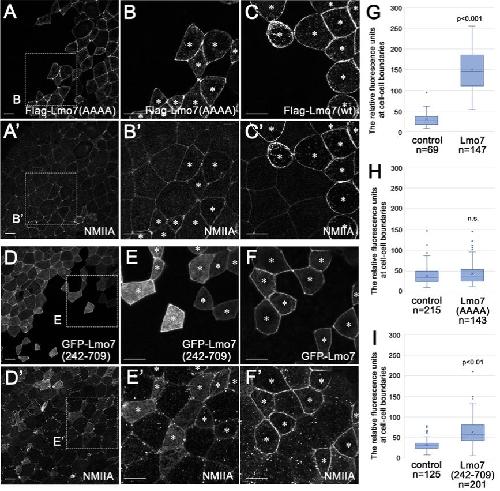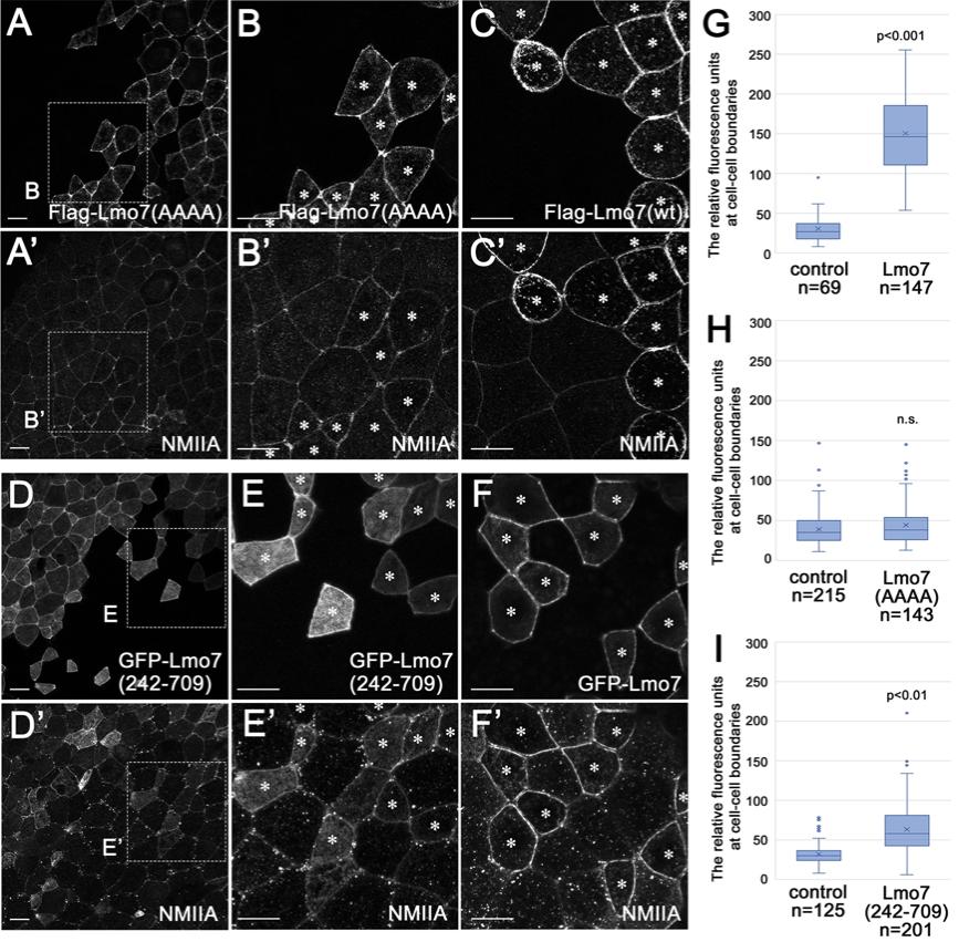 Figure 9. Lmo7 recruits NMII to apical junctions through NMIIBD. Embryos at the four- to eight-cell stage were injected with RNAs (0.5-1â ng) encoding full-length or mutant forms of Lmo7. The superficial ectoderm was imaged at stage 11 after staining using anti-Flag, GFP or NMIIA antibodies. Cells expressing Flag-Lmo7 constructs are marked by asterisks. (A-Bâ²) Lmo7(AAAA) does not cause NMIIA enrichment at apical junctions. Areas marked by rectangles in A and Aâ² are enlarged in B and Bâ². (C,Câ²) NMIIA enrichment in embryo expressing Flag-Lmo7, for comparison purposes. (D-Eâ²) Lmo7(aa 242-709) increases NMIIA accumulation. Areas marked by rectangles in D and Dâ² are enlarged in E and Eâ². (F,Fâ²) NMIIA enrichment in embryo expressing GFP-Lmo7, for comparison purposes. (G-I) Quantification of NMIIA accumulation at apical junctions in cells expressing GFP-Lmo7 (G), Flag-Lmo7(AAAA) (H) or GFP-Lmo7(aa 242-709) (I). Fluorescence intensity of NMIIA was measured at 3-10 locations within individual cell-cell boundaries. GFP-Lmo7(242-709) recruits NMIIA less effectively than full-length Lmo7. Boxes and whiskers indicate the lower and upper quartiles, and variabilities outside the upper and lower quartiles. Statistical significance of the difference was assessed by the MannâWhitney U-test. Scale bars: 10â µm. |
