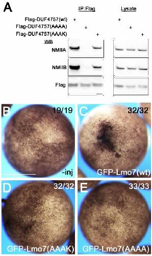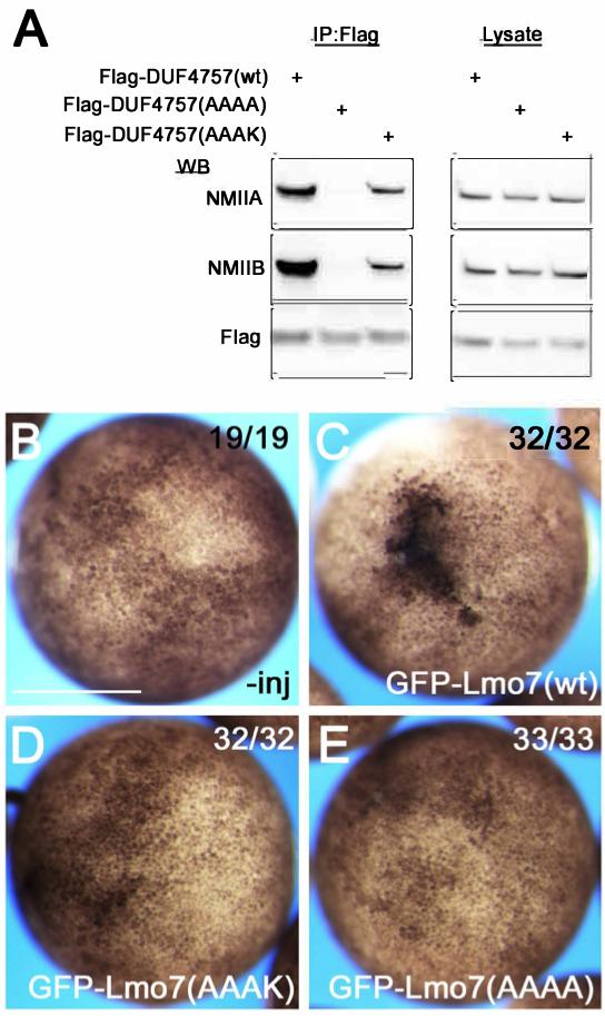 Fig. S4. The DUF4757 domain binds NMII heavy chains and is required for Lmo7-mediated apical constriction (A) Flag-tagged DUF4757 (wt), DUF4757 (WQWK->AAAA), or DUF4757 (WQWK->AAAK) were transfected into HEK293T cells. Cell lysates were immunoprecipitated with anti-Flag antibody. Co-immunoprecipitation of endogenous NMIIA and NMIIB was examined by western blot. (B-E) Representative images of apical pigment granule accumulation in embryos expressing Lmo7 (wt), Lmo7(AAAK), and Lmo7(AAAA). Relevant RNA was injected into two blastomeres of 4-8 cell Xenopus embryos. Scale bar: 500 μm in B. |