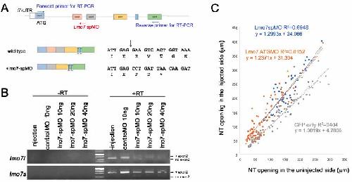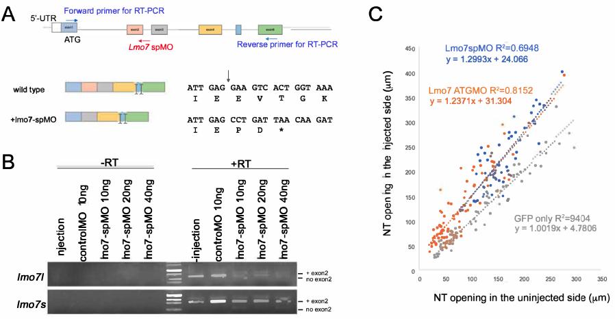 Fig. S7. Lmo7 knockdown delays neural tube closure (A) Schematics of Lmo7 splicing blocking morpholino (Lmo7-spMO) design. Lmo7-spMO is designed to target the splicing donor site of exon 2. Lmo7-spMO sequence show 100 and 84% match to Lmo7l and Lmo7s, respectively. (B) RT- PCR results of Lmo7l and Lmo7s transcripts in Lmo7-spMO injected embryos. Note the appearance of lower bands. DNA sequencing of these bands confirmed the absence of the exon 2 and premature stop codon (shown in A). (C) Neural tube closure delay in Lmo7 knockdown embryos, related to Figure 9L. X-axis and Y-axis represent the widest distance from the midline to the edge of the neural fold in the control uninjected side and the injected side, respectively. |