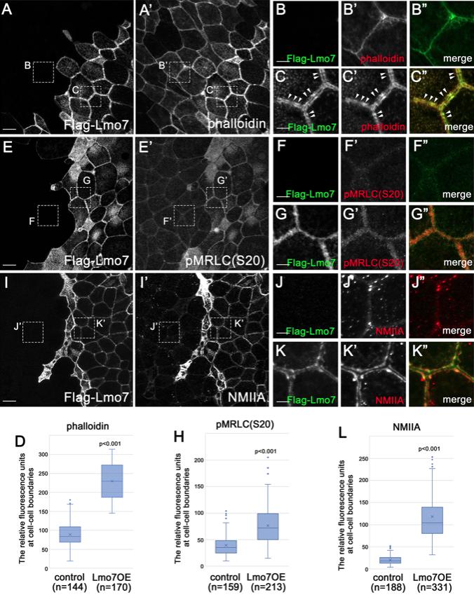 Figure 3. Lmo7 promotes actomyosin bundle formation at apical junctions. Effects of Flag-Lmo7 overexpression on peri-junctional actomyosin networks. Flag-Lmo7 RNA (1â ng) was injected into one blastomere of four- to eight-cell stage embryos. Stage 11 embryos were co-stained with phalloidin, anti-Flag, anti-pMRLC or anti-NMIIA antibodies, as indicated. The superficial ectoderm was imaged. (A-Câ³) F-actin bundle formation in cells expressing Flag-Lmo7. Areas marked by rectangles in A,Aâ² are enlarged in B-Câ³. (C-Câ³) Lmo7 double bands between two adjacent Flag-Lmo7-expressing cells overlap with F-actin double bands. There are periodic sarcomere-like structures (arrowheads). (D) Phalloidin fluorescence intensity was measured at the borders between two adjacent control cells (control) or two Lmo7-expressing cells (Lmo7OE). (E-Gâ³) MRLC phosphorylation at Ser 20. Areas marked by rectangles in E-Eâ² are enlarged in F-Gâ³. (H) Fluorescence intensity of pMRLC(S20) staining related to images in E-Gâ³. (I-Kâ³) NMIIA accumulation. Areas marked by rectangles are enlarged in J-Kâ³. (L) Fluorescence intensity of NMIIA staining related to images in I-Kâ³. The boxes and whiskers indicate the lower and upper quartiles, and variability outside the upper and lower quartiles. Statistical significance of the difference was assessed by the MannâWhitney U-test. Scale bars: 10â µm in A,E,I; 2â µm in B,C,F,G,J,K. Images shown are representative of two to four experiments. |