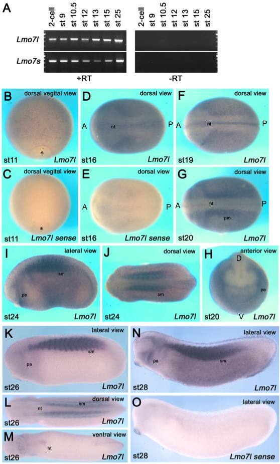Fig. S6. Lmo7 expression in Xenopus embryos (A) Lmo7l and Lmo7s expression was examined by RT-PCR. Both Lmo7l and Lmo7s are expressed maternally and zygotically throughout early embryonic development. (B-O) Expression of Lmo7l was examined by in situ hybridization. (B, D, F-N) Lmo7l antisense probes. (C, E, O) Lmo7l sense probes. Asterisks in B, C represent the blastopore. A: anterior. P: posterior. D: dorsal. V: ventral. nt: neural tube. pm: paraxial mesoderm. pe: preplacodal ectoderm. ht: heart. st: somites. pa: pharyngeal arches. |
