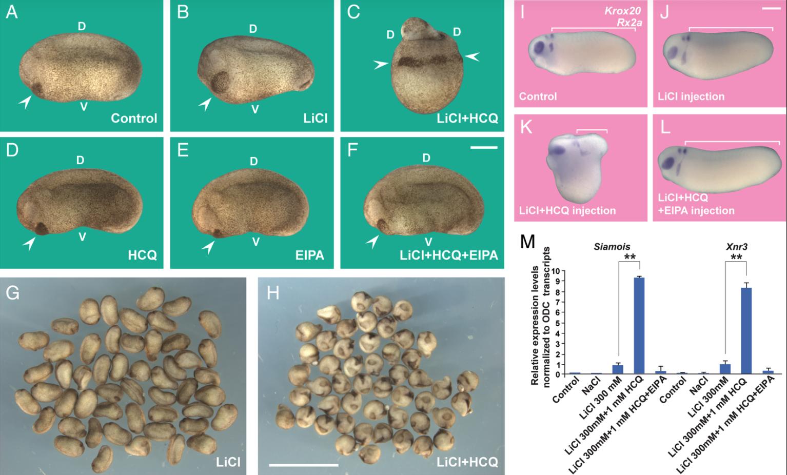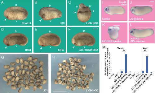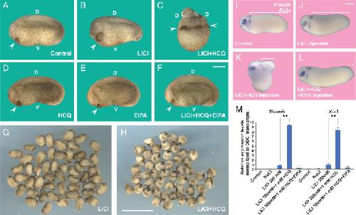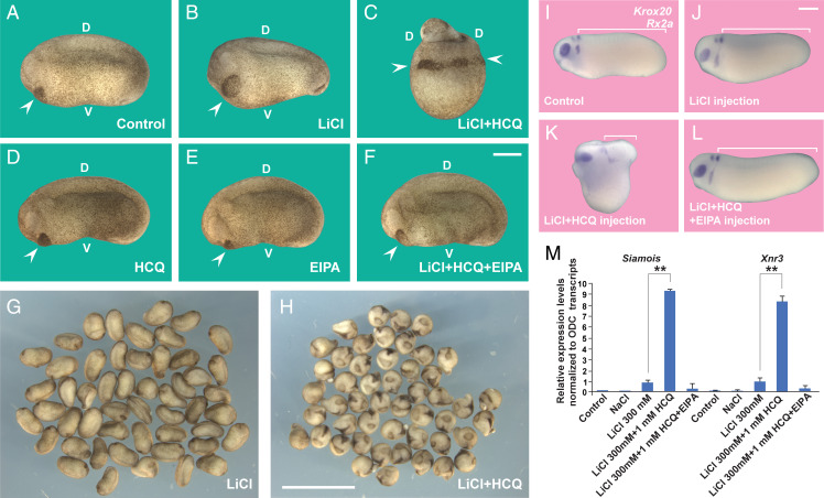 Figure 3. Dorsalization by LiCl microinjection is potentiated by HCQ in Xenopus. Embryos were microinjected with 4 nL of 300 mM LiCl, 1 mM HCQ, 1 mM EIPA, or their combinations one time ventrally at the four-cell stage. (A) Uninjected control embryo at stage 24. (B) LiCl moderately dorsalizes the embryo. (C) Low-dose HCQ strongly cooperates with LiCl. (D and E) HCQ or EIPA alone are without phenotype. (F) The macropinocytosis inhibitor EIPA blocks the dorsalization caused by LiCl plus HCQ. (G and H) Panoramic comparison of LiCl alone and LiCl plus HCQ. (IâL) In situ hybridization with Krox20 (hindbrain) and Rx2a (eye) markers showing that the trunk is reduced (brackets) and the head is expanded in embryos dorsalized by LiCl plus HCQ. Note rescue of trunk structures by EIPA. (M) The qRT-PCR at blastula stage 9.5 of the Wnt target genes Siamois and Xnr3 normalized for Ornithine decarboxylase (ODC). Note that low-concentration HCQ strongly enhances the response to microinjected LiCl, that this is blocked by EIPA, and that NaCl serves as a control for LiCl. Arrows indicate cement glant; D, dorsal; V, ventral. Numbers of embryos analyzed (five independent experiments) were as follows: A = 182; B = 137; C = 174; D = 142; E = 115. (Scale bars in F and K, 500 μm; scale bar in H, 5 mm.) Experiments in I represent biological triplicates; error bars denote SEM (n ⥠3) (**P < 0.01). See also SI Appendix, Fig. S4. |