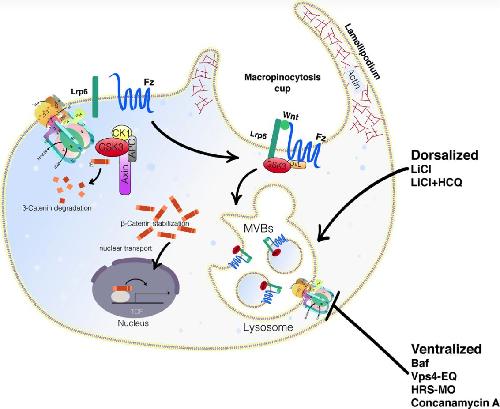Figure 5. Model of membrane trafficking during Wnt signaling highlighting the role of macropinocytosis, V-ATPase, MVBs, and lysosomes. Binding of Wnt to the Frizzled (Fz) and Lrp6 receptors results in a local inhibition of GSK3 activity that induces the actin machinery to form lamellipodia that engulf large amounts of liquid through macropinocytosis. In the presence of Wnt, plasma membrane is trafficked into MVBs that become lysosomes as they are activated by progressively decreasing pH. V-ATPase pumps protons into the lysosomal lumen, driving lysosomal acidification. Inhibiting V-ATPase (Baf or Concanamycin A) or MVB formation (Vps4-EQ or Hrs-MO) results in microcephalic embryos with increased ventral structures. LiCl mimics Wnt signaling by inhibiting GSK3, and low-dose HCQ expands the MVB compartment, facilitating Wnt signaling in mammalian cells and the dorsalization of Xenopus embryos. |
