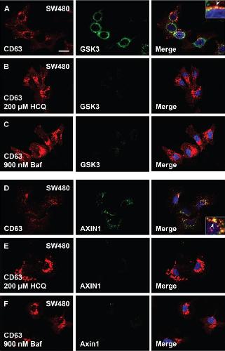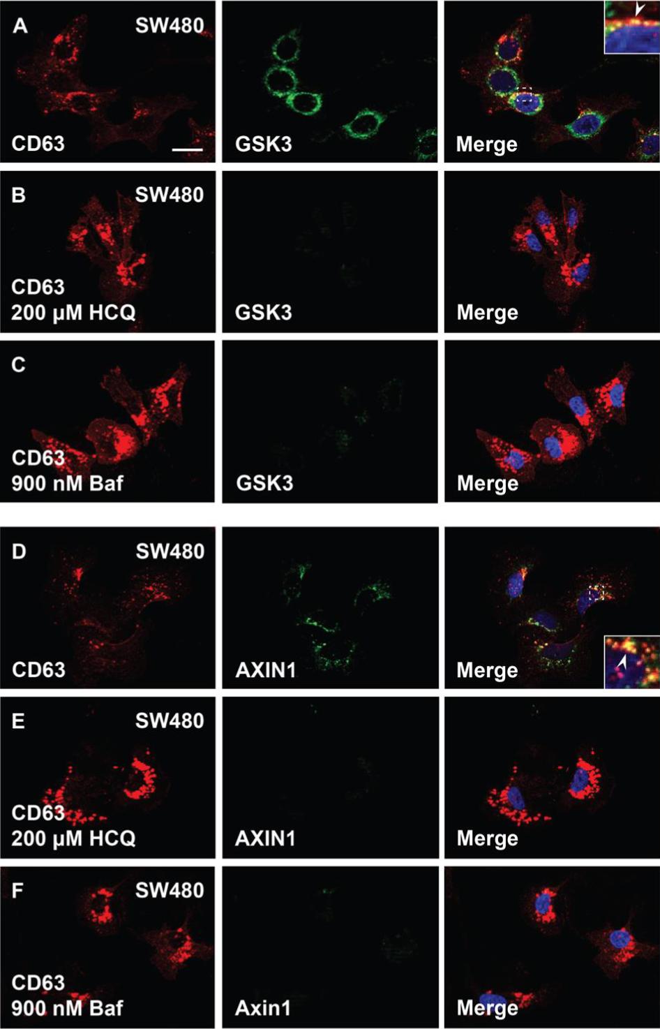 SI Appendix, Fig. S3. In colorectal carcinoma SW480 cells, Wnt components are localized in MVBs marked by CD63, and this localization is inhibited by high-dose HCQ or Bafilomycin. (A) SW480 cells showing endogenous GSK3 partially colocalized with the MVB marker CD63. (B) Overnight treatment with 200 μM HCQ, which alkalinizes lysosomes, prevents GSK3 localization while increasing the MVB/lysosomal compartment. (C) Bafilomycin also inhibits GSK3 vesicular localization. (D-F) Axin1 localizes to puncta that partially overlap with CD63 in SW480 cells with constitutive Wnt signaling, and this localization is eliminated by treatments that alkalinize lysosomes. Insets show higher magnifications of colocalizations (arrowheads). Nuclei were stained with DAPI. Scale bars, 10 μm. |