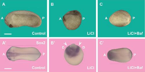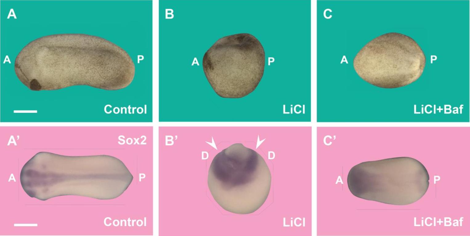 SI Appendix, Fig. S5. LiCl treatment by immersion at 32-cell stage radially dorsalized embryos and this was blocked by subsequent inhibition of V-ATPase with Baf. (A) Control embryo cultured in 0.1 MMR saline. (B) Embryo partially dorsalized by LiCl (300 mM for 7 min), note the blastopore at the top and lack of trunk-tail structures. (C) Embryos were treated with LiCl and subsequently immersed in Baf (5 μM for 7 min) in 0.1 MMR saline; note that the LiCl effect was blocked. (Aâ-Câ) In situ hybridizations of siblings with the pan-neural marker Sox2. Note the strong induction of a radial CNS surrounding the blastopore (arrowheads) by LiCl, and that Baf blocks the increased neural signal, consistent with the microcephaly phenotype observed after treatment of wild-type embryos. D, dorsal; A, anterior; P, posterior. Numbers of embryos analyzed were A=76; B=110; C=109 per condition, 4 independent experiments. Scale bars, 500 ïm. |