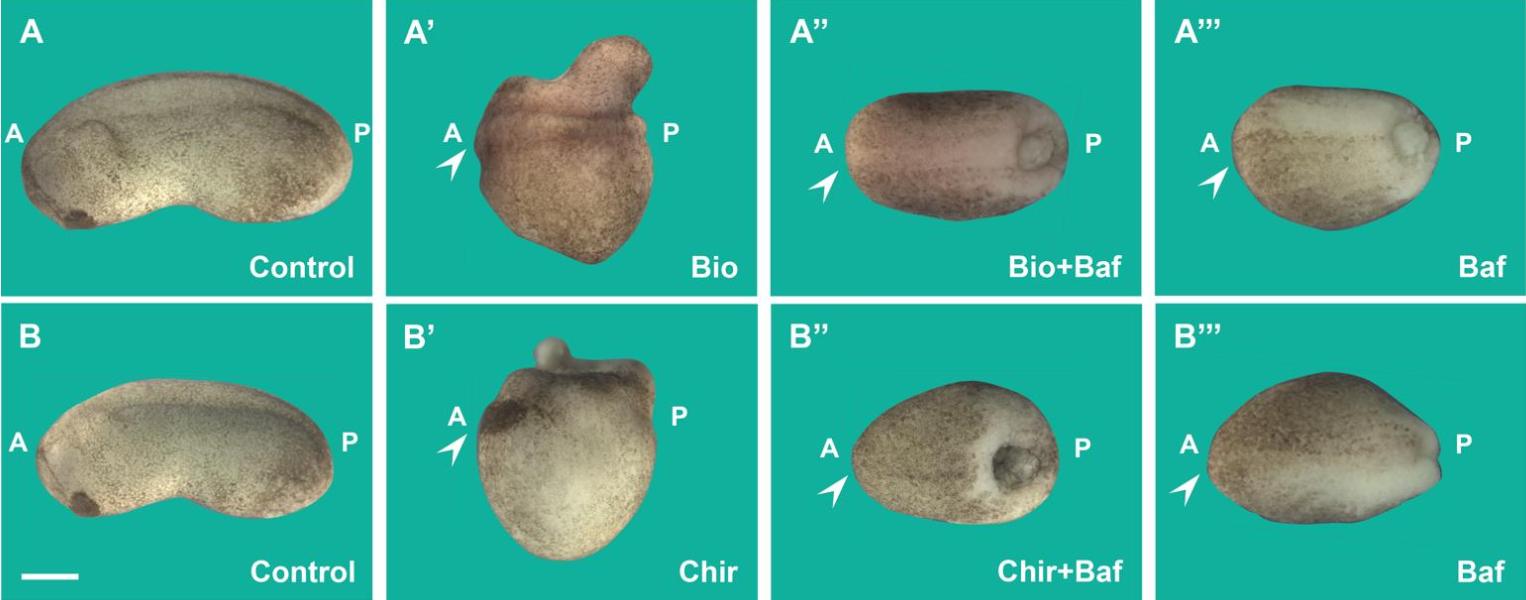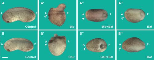 SI Appendix, Fig. S6. Mimicking Wnt signaling with specific chemical GSK3 inhibitors can be blocked by the lysosomal acidification inhibitor Bafilomycin. (A-Aâââ) Xenopus embryos were incubated at the 32-cell stage with the GSK3 inhibitor BIO (6-bromoindirubin-3'-oxime, 30 mM) in the presence or absence of Baf (5 mM). The embryos were removed at stage 9.5 and further cultured to the tadpole stage in 0.1 MMR solution. Note that Baf treatment blocked the dorsalizing phenotype caused by inhibiting GSK3 with BIO. (B-Bâââ) Xenopus embryos were incubated at the 32-cell stage with the GSK3 inhibitor CHIR99021 (60 ïM) in the presence or absence of Baf (5 ïM); embryos were cultured with the reagents until the tadpole stage. Similar results were obtained when GSK3 was inhibited by immersing embryos in LiCl at the 32-cell stage (SI Appendix, Fig. S5). Arrowheads indicate anterior defects; A, anterior; P, posterior. Numbers of embryos analyzed (4 independent experiments) were as follows A=152; Aâ=145; Aââ=157; Aâââ=136; B=143; Bâ=135; Bââ=148; Bâââ=146. Scale bar, 500 mm. |