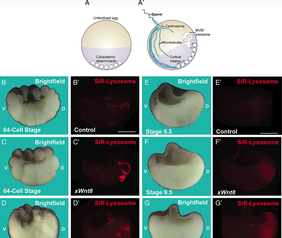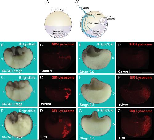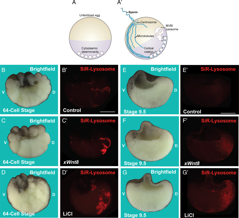 Fig. 1. Lysosomes are activated on the dorsal side at the 64-cell stage embryos, and this asymmetry is increased by xWnt8 mRNA or LiCl microinjection. (A) The unfertilized egg contains cytoplasmic determinants indicated by membrane-bounded organelles that contain Dvl. (A’) Sperm entry introduces the centrosome which nucleates microtubules that drive cortical rotation of cytoplasmic determinants. The hypothesis tested here is that MVBs and lysosomes are activated by the maternal Wnt-like signal. (B and B’) SiR-lysosome fluorophore stains activated cathepsin D in dorsal cells at the 64-cell stage. (C’–D’) Microinjection of 2 pg of xWnt8 mRNA or 4 nL of 300 mM LiCl into the vegetal pole at four cells greatly increases active lysosomes. (E–G’) The increase in lysosomal active cathepsin D induced by Wnt and LiCl was also observed at the blastula stage. D, dorsal; V, ventral. Numbers of embryos analyzed were as follows: B = 31, 100%; C = 29, 93.2%; D = 32, about 90% with dorsal signal, five independent experiments; E = 27, 100%; F = 31; 92%; G = 25, 94%. (Scale bars, 500 μm.) See also SI Appendix, Fig. S1. |