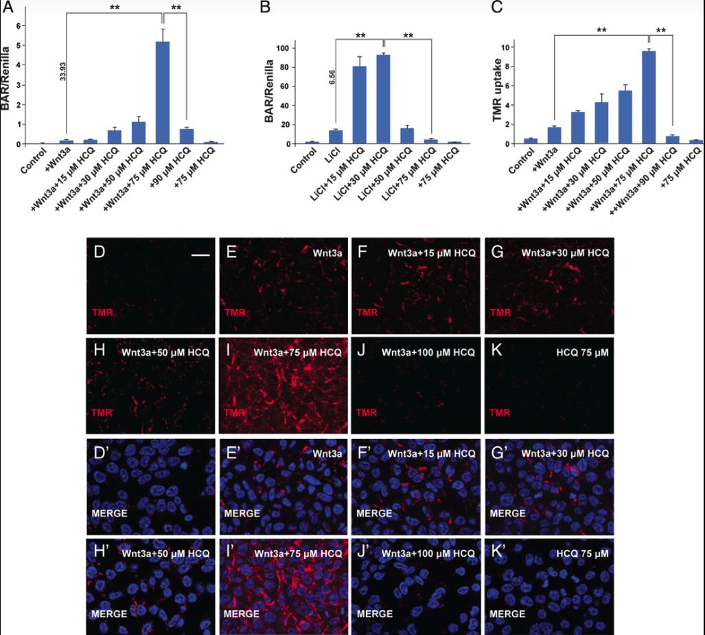 Fig. 2. Wnt3a, LiCl transcriptional activity, and macropinocytosis are potentiated by low-dose HCQ. All assays were performed in HEK293-BR cells that contain stably integrated BAR and Renilla reporter genes. (A) Wnt3a treatment for 18 h was strongly potentiated by 75 µM HCQ and inhibited by higher concentrations. (B) HCQ increased LiCl-induced β-catenin signaling but at lower concentrations. (C) Macropinocytosis of TMR-dextran 70 kDa was stimulated by low doses of HCQ and inhibited at high levels. Note that, in all cases, HCQ was without effect in the absence of Wnt or LiCl treatment. Experiments represent biological triplicates. Error bars denote SEM (n ≥ 3) (**P < 0.01). (D and D’) HEK-293T cells have very low levels of macropinocytosis after 1 h of incubation with a macropinocytosis marker TMR-dextran 70 kDa. (E and E’) Addition of Wnt3a (100 ng/mL) increases macropinocytosis. (F–I’’) The addition of HCQ potentiates Wnt-stimulated macropinocytosis, particularly at 75 µM HCQ. (G and G’’) At higher concentrations (100 µM), HCQ inhibits macropinocytosis. (K and K’’) HCQ alone (75 µM) has no effect on macropinocytosis. Wnt3a induced micropinocytosis, and this is greatly potentiated by low-dose HCQ and inhibited by high dose HCQ, while HCQ alone has no effect on macropinocytosis The results of a similar experiment to that shown here were quantified by spectrophotometry in C. (Scale bars, 10 μm.) See also SI Appendix, Figs. S2 and S3. |