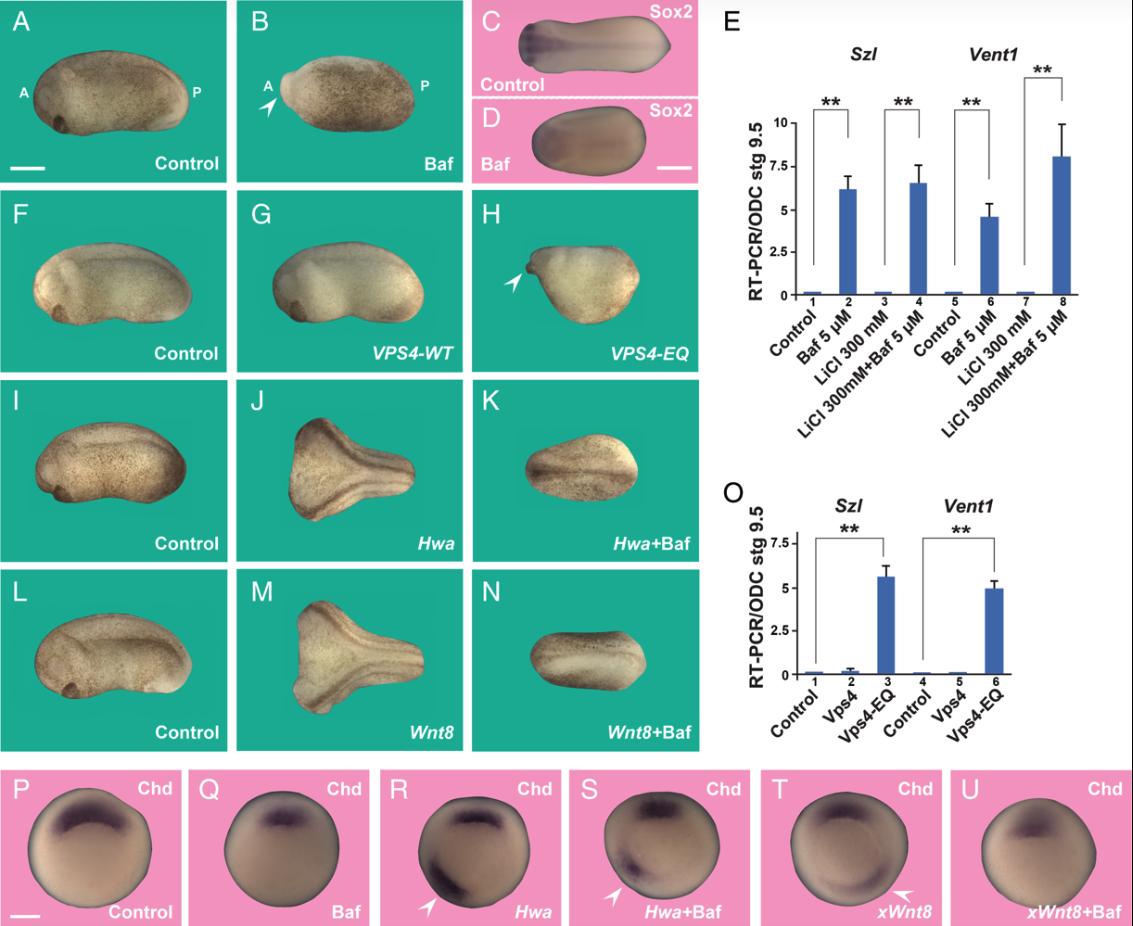 Figure 4. Dorsal cytoplasmic determinant activity requires lysosomal acidification and the ESCRT machinery; Hwa signaling is inhibited by Bafilomycin. (A and B) Immersion of Xenopus embryos at the 32-cell stage in 5 µM Baf for 7 min results in a partially ventralized phenotype with microcephaly, loss of cement gland, and pigmentation in ventral and posterior ectoderm. A, anterior; P, posterior. (C and D) Baf reduces the panneural marker Sox2. (EâG) Inhibiting ESCRT machinery with Vps4-EQ, but not Vps4-WT, mRNA (two dorsal injections of 400 pg at the four-cell stage) reduces axis formation. Arrowhead indicates microcephaly. (HâJ) Microinjection of xHwa mRNA (10 pg one time ventrally at the four-cell stage) induces complete secondary axes that are blocked by Baf incubation at the 32-cell stage. (KâM) The xWnt8 mRNA second axes are also inhibited by the V-ATPase inhibitor Baf. (N) The qRT-PCR of blastula embryos showing that Baf treatment at the 32-cell stage increases expression of the ventral markers Szl and Vent1 in wild-type and LiCl-treated embryos. (O) The qRT-PCR of blastula embryos showing that inhibiting the ESCRT machinery with the Vps4-EQ point mutation increases transcription of the ventral markers Szl and Vent1 in Xenopus. (PâU) In situ hybridizations of chordin at the gastrula stage showing partial inhibition of the organizer by Baf in control, Hwa, and xWnt8 axes; arrowheads indicate ectopic chd expression. Numbers of embryos analyzed were as follows: A = 94; B = 77; E = 89; F = 62; G = 46; H = 235; I = 67; J = 71; K = 182; L = 57; M = 70 (two independent experiments). (Scale bars, 500 μm.) The qRT-PCR experiments represent biological triplicates; error bars denote SEM (n ⥠3) (**P < 0.01). See also SI Appendix, Figs. S5âS8. |