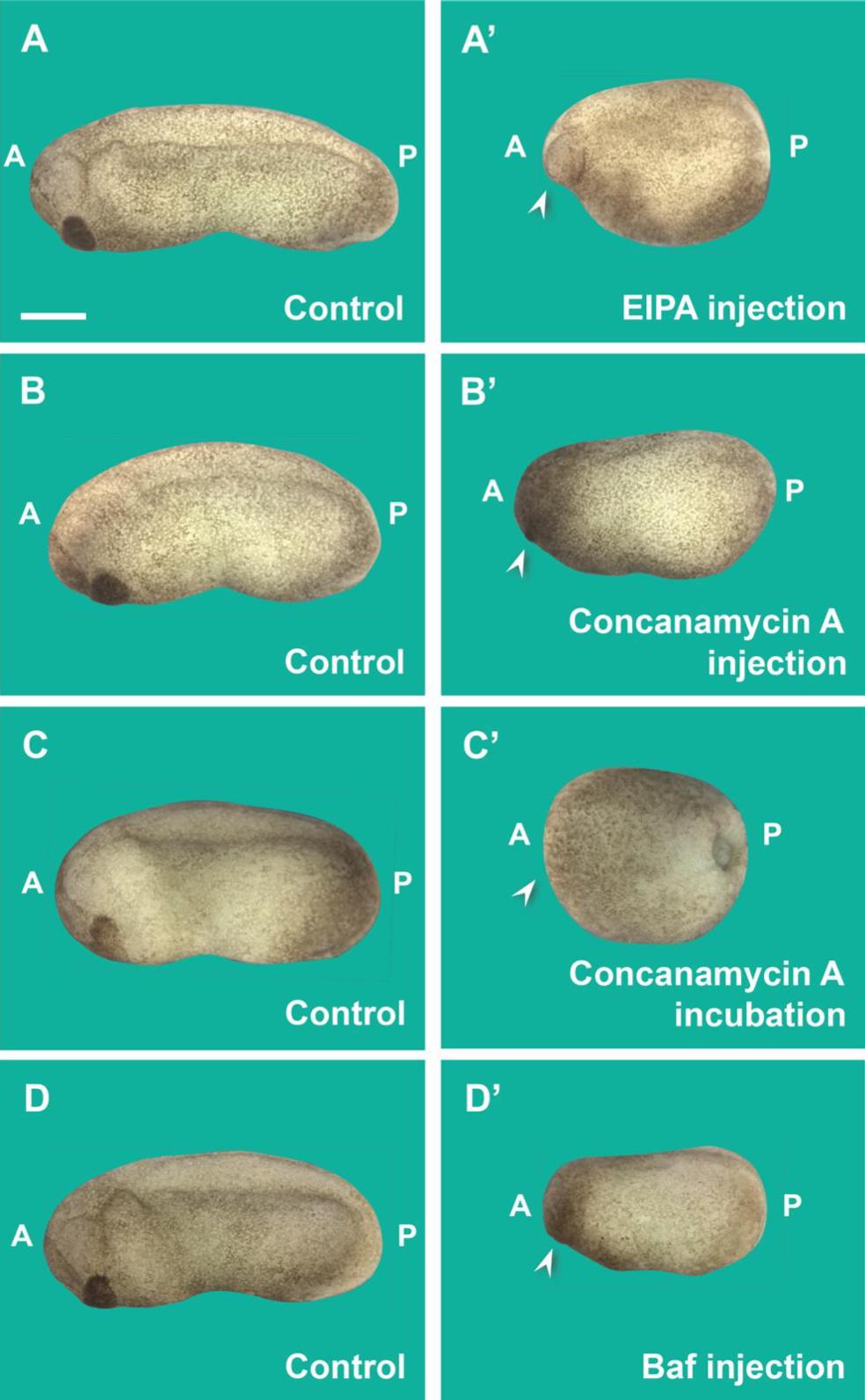 SI Appendix, Fig. S7. Lysosomal function and membrane trafficking are required for endogenous dorsal axis formation. (A and Aâ) Frog embryos were injected into two dorsal blastomeres at the 4-cell stage with the Na+/H+ exchanger inhibitor EIPA (4 nl at 2 mM). EIPA is difficult to dissolve in aqueous solution at higher concentrations, and could not be used in immersion experiments. (B and Bâ) The V- ATPase inhibitor Concanamycin A (4 nl of 5 μM) was injected into the two dorsal blastomeres at 4-cell. (C and Câ) Incubation of whole embryos for 7 minutes at the 32-cell stage with 5 μM Concanamycin A resulted in robust ventralization of embryos. (D and Dâ) Injection of the V-ATPase inhibitor Baf also caused ventralization; we note that immersion in Baf is a very effective treatment (Fig. 4B). These experiments show that multiple treatments that inhibit lysosomal function affect dorsal axis formation. Arrowheads indicate anterior defects; A, anterior; P, posterior. The numbers of embryos analyzed (2 independent experiments) were as follows A=63; Aâ=39; (4 independent experiments) B=92; Bâ=114; C=127; (2 independent experiments) Câ=138; D=96; Dâ=78. Scale bar 500 mm. |