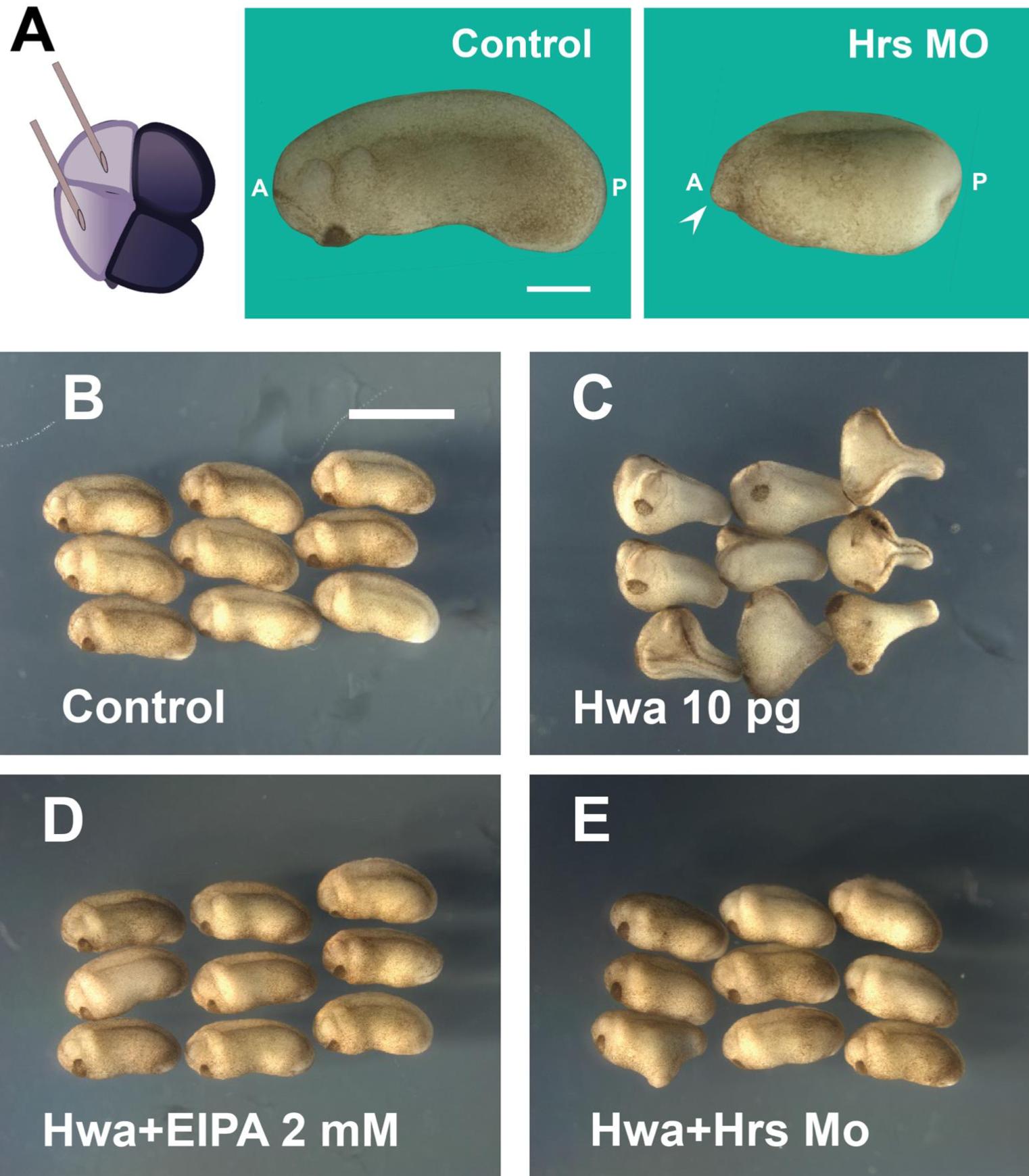 SI Appendix, Fig. S8. The ESCRT machinery component HRS is required for axis formation, and twinning by microinjected cytoplasmic determinant Hwa requires membrane trafficking. (A) Microinjection of antisense Hrs MO, known to specifically block MVB formation, interferes with axis formation. Embryos were injected with MOs 2 times dorsally at the 4-cell stage, as indicated by the diagram. Arrowhead indicates the defect in head and cement gland formation. The results indicate that the ESCRT machinery is required for axis formation. (B) Uninjected controls for the Hwa experiment. (C) Hwa mRNA induces 100% of complete secondary axes. In our hands, Hwa is even more effective than xWnt8 in inducing complete twinning. (D) Co-injection of the Na+/H+ exchanger inhibitor EIPA (2 mM) abolishes Hwa activity. (E) Interfering with MVB formation by co-injection of Hrs MO (0.3 mM, 4 nl) prevents Hwa function. Together with the inhibition of Hwa by Baf (Fig. 4H-J in main text), this result strongly suggests that function of the Hwa transmembrane protein requires membrane trafficking. A, anterior; P, posterior. Numbers of embryos analysed were; control embryos in A n=115, HRS MO n=107, 7 independent experiments; B=148; C=142; D=120 (3 independent experiments); E=45 per condition. Scale bars for A 500 ïm, for B, 2 mm. |