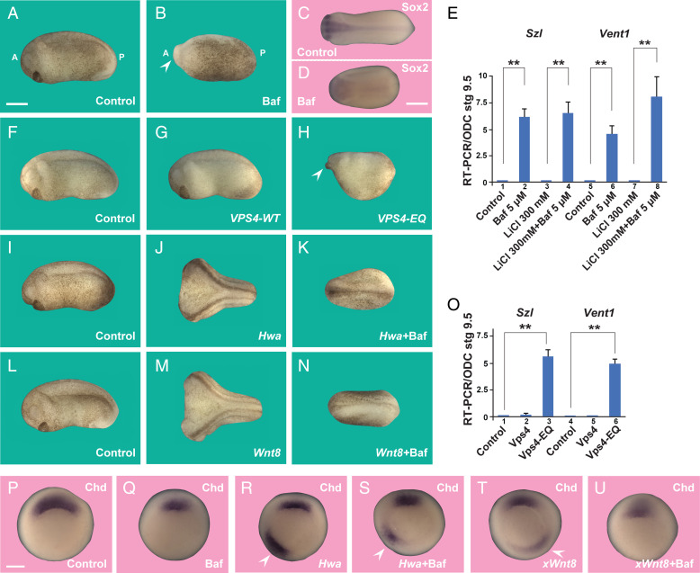 Fig. 4. Dorsal cytoplasmic determinant activity requires lysosomal acidification and the ESCRT machinery; Hwa signaling is inhibited by Bafilomycin. (A and B) Immersion of Xenopus embryos at the 32-cell stage in 5 µM Baf for 7 min results in a partially ventralized phenotype with microcephaly, loss of cement gland, and pigmentation in ventral and posterior ectoderm. A, anterior; P, posterior. (C and D) Baf reduces the panneural marker Sox2. (E–G) Inhibiting ESCRT machinery with Vps4-EQ, but not Vps4-WT, mRNA (two dorsal injections of 400 pg at the four-cell stage) reduces axis formation. Arrowhead indicates microcephaly. (H–J) Microinjection of xHwa mRNA (10 pg one time ventrally at the four-cell stage) induces complete secondary axes that are blocked by Baf incubation at the 32-cell stage. (K–M) The xWnt8 mRNA second axes are also inhibited by the V-ATPase inhibitor Baf. (N) The qRT-PCR of blastula embryos showing that Baf treatment at the 32-cell stage increases expression of the ventral markers Szl and Vent1 in wild-type and LiCl-treated embryos. (O) The qRT-PCR of blastula embryos showing that inhibiting the ESCRT machinery with the Vps4-EQ point mutation increases transcription of the ventral markers Szl and Vent1 in Xenopus. (P–U) In situ hybridizations of chordin at the gastrula stage showing partial inhibition of the organizer by Baf in control, Hwa, and xWnt8 axes; arrowheads indicate ectopic chd expression. Numbers of embryos analyzed were as follows: A = 94; B = 77; E = 89; F = 62; G = 46; H = 235; I = 67; J = 71; K = 182; L = 57; M = 70 (two independent experiments). (Scale bars, 500 μm.) The qRT-PCR experiments represent biological triplicates; error bars denote SEM (n ≥ 3) (**P < 0.01). See also SI Appendix, Figs. S5–S8. |
