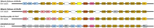 Figure 3. Synteny analysis of slc15a2 genomic region in teleostsFrom top, slc15a2a and slc15a2b genes from Atlantic salmon (Salmo salar), slc15a2 from Northern pike (Esox lucius) and zebrafish (Danio rerio). The chromosome (Chr) number is indicated below each species name. The central pentagons in dark orange indicate the slc15a2 genes. For each slc15a2 gene, 10 flanking genes upstream and downstream are represented by different coloured pentagons. Each colour identifies sets of orthologous genes based on the degree of conservation between species and between the chromosomes within species and white pentagons represent non‐identified genes. The pentagons point in the direction of transcription and only protein‐coding genes are indicated. [Colour figure can be viewed at wileyonlinelibrary.com]