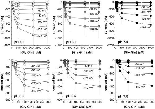 The current values evaluated in the presence of increasing concentrations of Gly‐Gln under each tested voltage (reported in Fig. 7 as means (SD)) were subsequently fitted with eqn (1) to obtain the relative maximal current (I
