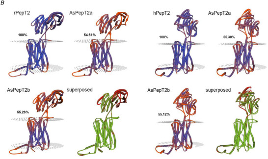 Figure 2. Phylogenetic relationship of fish and mammalian PepT2 based on predicted protein sequencesThe (unrooted) phylogenetic tree was constructed based on deduced PepT2 amino acid sequences using the maximum likelihood method, 1000 bootstrap replicates, and Jones‐Taylor‐Thornton + G matrix‐based model in MEGA X. The percentage of trees in which the associated taxa clustered together is shown next to the branches. Protein Acc. Nos. for GenBank or Ensembl databases are provided next to species common name. [Colour figure can be viewed at wileyonlinelibrary.com]