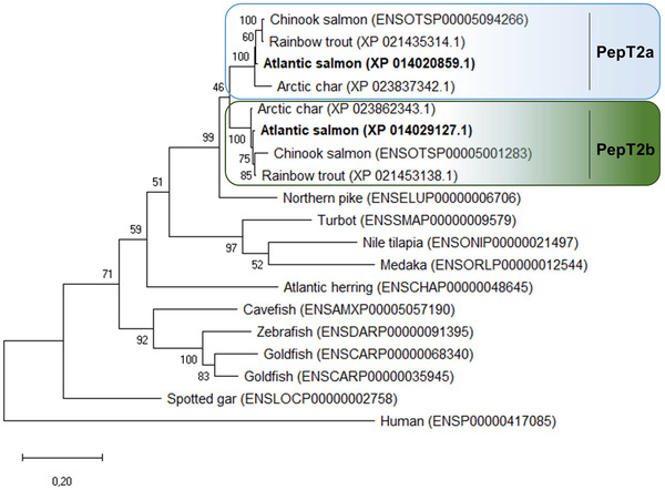 Figure 2. Phylogenetic relationship of fish and mammalian PepT2 based on predicted protein sequencesThe (unrooted) phylogenetic tree was constructed based on deduced PepT2 amino acid sequences using the maximum likelihood method, 1000 bootstrap replicates, and Jones‐Taylor‐Thornton + G matrix‐based model in MEGA X. The percentage of trees in which the associated taxa clustered together is shown next to the branches. Protein Acc. Nos. for GenBank or Ensembl databases are provided next to species common name. [Colour figure can be viewed at wileyonlinelibrary.com]
