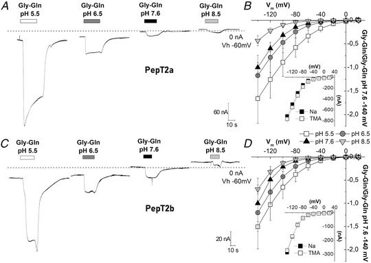 Figure 5. Transport of Gly‐Gln in Xenopus oocytes expressing Atlantic salmon PepT2a (A, B) and PepT2b (C, D)In A and C, representative traces (1 mmol l−1 Gly‐Gln in NaCl solution), the dashed line represents the baseline (conventionally fixed at the value in NaCl solution at pH 7.6). B and D, current/voltage relationships (the values are the means (SD) of the current normalized to the mean value of the current at −140 mV and pH 7.6); insets, currents at pH 6.5 in the presence of 98 mmol l−1 NaCl or tetraethylammonium chloride. Data are means (SD) from 4–24 oocytes from 1–5 batches.