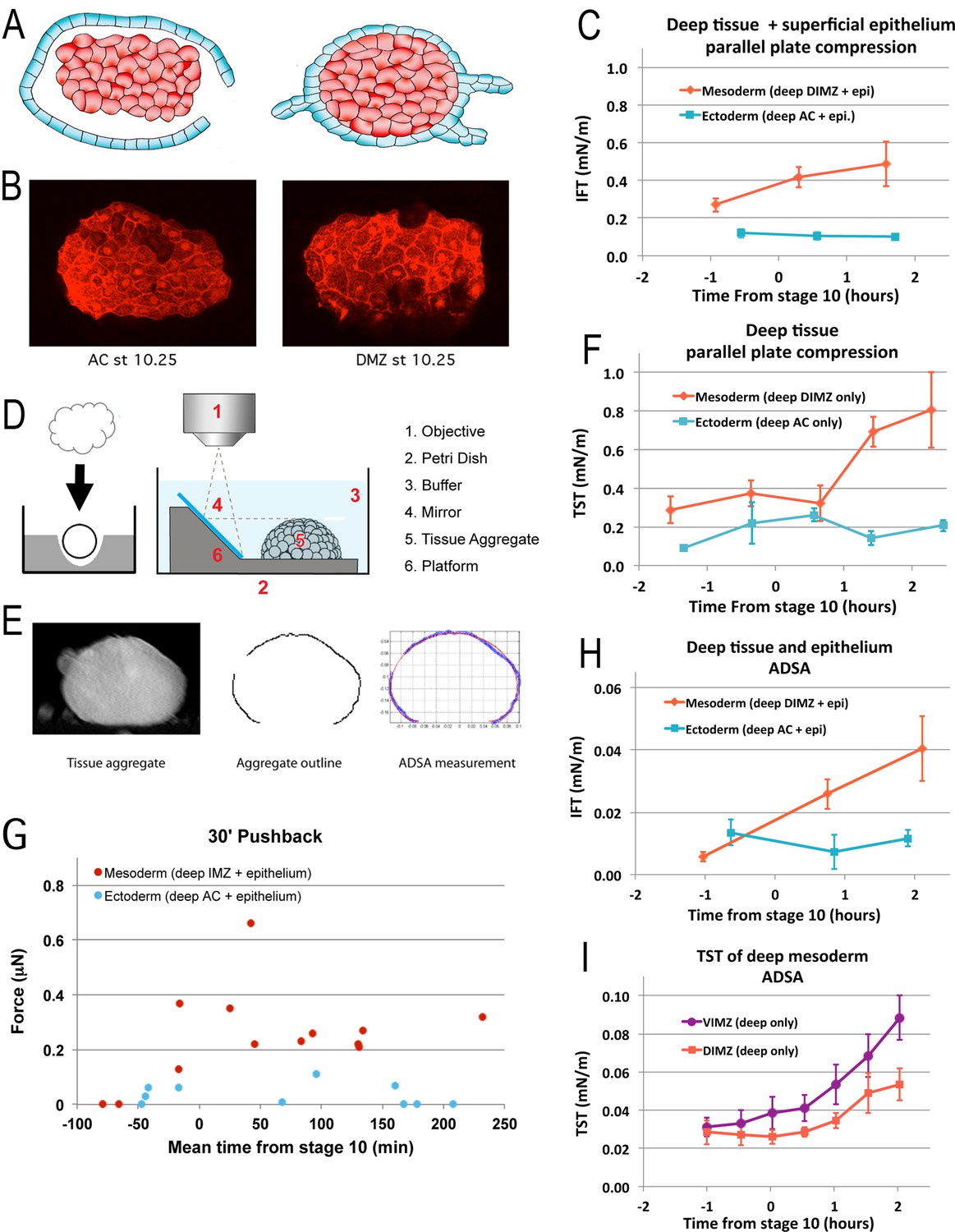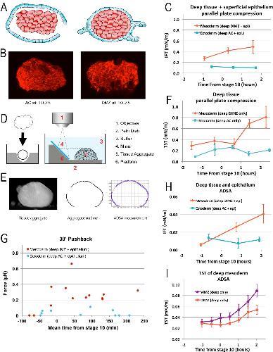 Figure 5. Tissue surface tension and interfacial tension rise in association with the onset of CT. Aggregates of deep tissue wrapped in excess superficial epithelium (âwontonsâ), (A), were used to measure the IFT between DIMZ (Mesoderm) or AC (Ectoderm) deep tissue and epithelium (C), assayed by parallel plate compression (using a MicroSquisher; see Materials and methods and Figure 5âfigure supplement 1). Aggregates of deep mesodermal or ectodermal tissue, prepared by explanting deep tissue into an agarose well and allowing the explant to round up (D, left panel) were similarly used to measure TST (F). IFT and TST were determined using outline and analysis features of the MicroSquisher software, SquisherJoy (see Materials and methods and Figure 5âfigure supplement 1). For IFT, the outline of the wrapped tissue was used as an approximation for the deep tissue. nâs = 4â9 for mesodermal and ectodermal IFT; nâs = 4â7 explants for mesodermal, 1â5 for ectodermal TST; error bars = SEM; the same explants were measured at sequential time points, roughly 1 hr apart. Axisymmetric drop shape analysis (ADSA)(David et al., 2009; Luu et al., 2011) of explants was also used to measure surface tensions. Wontons made with rhodamine dextran labeled deep tissues wrapped in unlabeled epithelium were allowed come to equilibrium and develop for a time (Video 13), then fixed, the wonton cut in half and LSCM used to capture the profile of each half (B). ADSA of the profile (E) was used to determine the IFT between the deep and superficial tissues (H); nâs = 3â8 explants per time point; error bars = SEM. To measure TST with ADSA, deep cell aggregates were prepared as above (D, left panel), then the profile of the aggregate under 1 g was imaged at sequential time points using a 45° mirror (D, right panel; Video 14*). ADSA was used on outlines of the aggregate to determine the TST of each aggregate over time (I); the mean of TSTs for dorsal and ventral IMZ tissue (DIMZ, VIMZ) was plotted over time (I); nâs = 4â6; error bars = SEM. The MicroSquisher was also used to determine the amount of compression force that wrapped deep tissue (IMZ wontons (Mesoderm) and AC wontons and sandwiches (Ectoderm)) could generate in 30 min (G); each point represents a single run. |