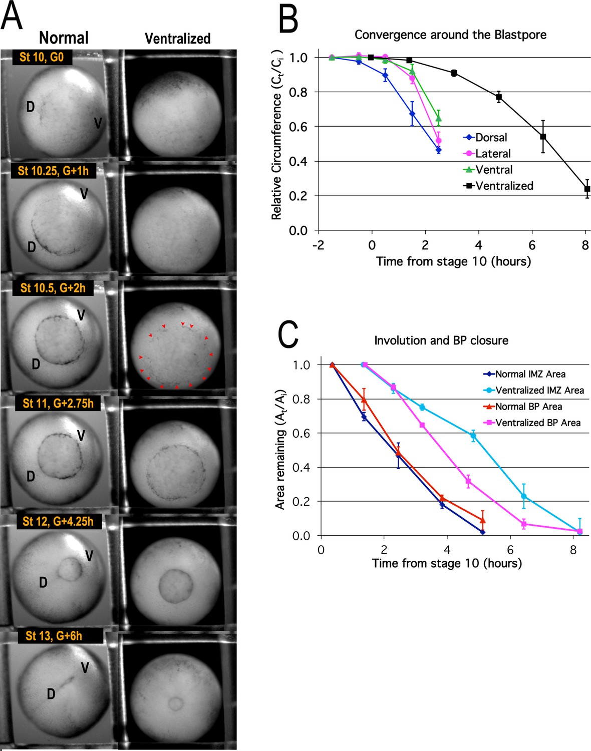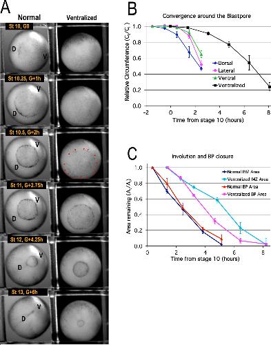 Figure 6. Blastopore closure. Time lapse movie frames of normal (left) and ventralized embryos (right) are shown at the stages and times indicated (A, Video 1*). Dorsal (âDâ) and ventral (âVâ) sides of the embryo are indicated. Blastopore formation (blastopore pigment line formation) and subsequent blastopore closure (see Figure 6âfigure supplement 1 for details) is delayed in the ventralized embryos, with formation of the blastopore usually occurring at control Stage 10.5 (red pointers), two hours after the onset of gastrulation at Stage 10 (G + 2 h). The blastopore of ventralized embryos closes symmetrically whereas the normal closure is biased toward the future ventral side (compare Stages 10.5 vs 12). Convergence (B) in the dorsal, lateral and ventral quadrants of the pre-involution IMZ of normal embryos (n = 3 or 4 embryos per time point; error bars = SEM within region, across embryos) and in the entire IMZ of ventralized embryos (n = 5 embryos per time point; error bars = SEM across embryos). Change in superficial area compared to its original size (At/Ai) of the pre-involution IMZ, a measure of its involution, and the area of the exposed vegetal endoderm, a measure of blastopore closure (C) (n = 3 normal embryos and 3 ventralized embryos; error bars = SEM across embryos). For both B and C, the same embryos were measured at sequential time points. |