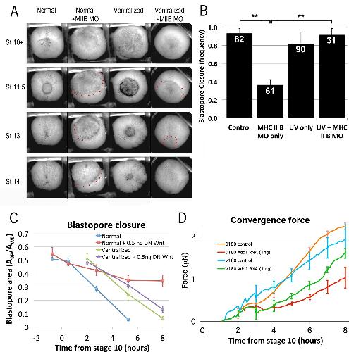 Figure 7. CT and CE depend on different molecular pathways. (A) Representative stills of time lapse movies (Video 22*) comparing blastopore closure in normal and ventralized embryos, un-injected or injected with an MHC IIB morpholino. The region just outside the blastopore or forming blastopore are indicated by red dots in cases where it is difficult to see. (B) Frequency of blastopore closure by Stage 20 (G + 13 h effective success of blastopore closure) was scored for embryos from 4 different clutches of embryos (nâs indicated on chart); ** = p < 0.01. Comparison of the extent of blastopore closure over time in normal and ventralized embryos, either un-injected or injected with 0.5 ng dnWnt11 RNA (C; see for example Figure 7âfigure supplement 1 and Video 23*), based on the projected area of the blastopore, Abp, divided by the projected area of the whole embryo, Awe, measured from time lapse movies (n = 4 embryos for each treatment). Force measurements (Shook et al., 2018) of D180 or V180 explants made from embryos, either un-injected or injected with 1 ng Xdd1 RNA (D; nâs = 3â4 explants per treatment). Errors bars in all cases = SEM. |