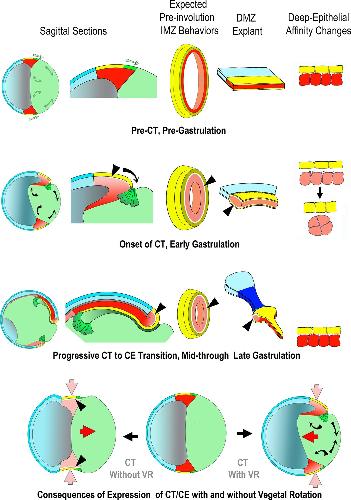 Figure 8. Proposed mechanism of CT, its function in the gastrula and in explants, its relationship to CE and its integration with the other movements of gastrulation. Yellow/green = endoderm, pink/red = mesoderm, blue = ectoderm (See Figure 1 for details). Prior to the onset of gastrulation (top row), vegetal rotation (VR) (Sagittal Sections, gray arrows) has not yet occurred and the IMZ annulus (3rd column) remains stable, as does the IMZ explant (4th column), due to a stable deep-epithelial cell affinity (far right). With the onset of gastrulation and CT (2nd row), apical constriction of the lower IMZ epithelium (bottle cell formation â Sagittal Sections, dark green), VR, involution and invagination begin (Sagittal Sections, black arrows). Co-incident with bottle cell formation, the deep mesodermal tissue begins to lose its affinity with the overlying epithelium. During early gastrulation both tissue surface tension of the IMZ as a whole and its interfacial tension with an epithelium increase, resulting in a tendency for the IMZ to minimize its surface area by converging and thickening (2nd row, far right). This loss of affinity at the interface of deep and epithelial tissue (2nd and 3rd rows, shown by white spaces between epithelial and deep, at black arrowhead pointers) increases the IFT between deep and superficial layers, resulting in both convergence and thickening of the IMZ of the explants (CT, second row, bulge in DMZ explant). Increased IFT would have a tendency to thicken and decrease the circumference of the IMZ annulus in embryos (3rd column, 2nd row) were it not resisted by adjacent tissue, so instead generates a pre-involution tensile force around the blastopore and converges, but does not thicken (not shown). In explants, the weak affinity of the IMZ epithelium to the underlying deep region results in its retraction, initially from the leading edge mesoderm (not shown), whereas in the intact embryo, the IMZ epithelium is tightly attached at its vegetal edge to the forming bottle cells, which in turn are tightly attached to the adjacent vegetal endodermal tissues. Thus the IMZ epithelium is pulled along with the bottle cells as they move inside the blastopore (1st, 2nd column). During early involution, as the lower edge of the IMZ involutes, it transitions from expressing CT to expressing directed migration (2nd column, 2nd row), and during later involution, the upper IMZ transitions to expressing CE (2nd column, 3rd row). In the case of CE, this transition is accompanied by regaining a high deep-epithelial affinity (loss of white space, on involution, 2nd column, 2nd and 3rd rows). In explants, the later transition from CT to CE first occurs in tissue laying dorsally at the vegetal edge of the upper IMZ, and continues in an anterior to posterior progression (Shih and Keller, 1992a). The snout of tissue extending from the thickened collar of mesoderm in the explant reflects the onset of CE and is coincident with the progressive return of the affinity between the deep cells and the bottle cell epithelium (3rd row, 4th column). In the meantime, VR (black arrows, 1st column, 2nd row) has moved the vegetal endoderm inward at the onset of gastrulation such that convergence force generated by CT cooperates with VR to move the IMZ vegetally and push the vegetal endoderm inside (compare to 1st column, 1st row). VR, CT and CE also cooperate to stretch the ectodermal (NIMZ-AC) region by pulling it vegetally (1st column, 1st to 3rd rows). When CE begins at Stage 10.5, it has been positioned by the actions of CT and VR such that it further moves the IMZ vegetally and pushes the vegetal endoderm inside (4th row, right, red arrow), in contrast to converging in its initially more equatorial position, where it would tend to push the vegetal endoderm out, rather than in (4th row, left, red arrow). |