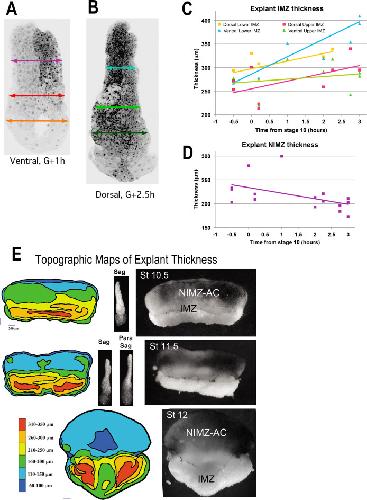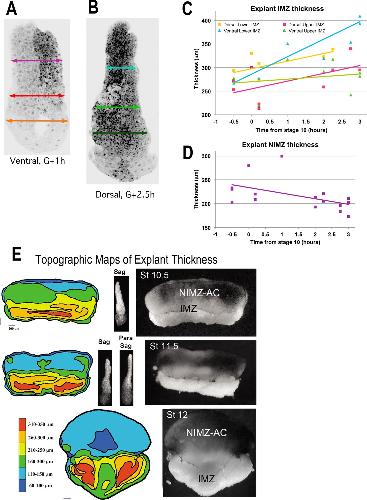 Figure 3-Figure Supplement 1. Giant sandwich explants were made from rhodamine dextran amine (RDA) labeled embryos (A,B) prior to the onset of gastrulation, allowed to heal under a cover glass for 30 minutes, then allowed to equilibrate for at least 1 hour after cover glass removal, prior to fixation. Explants were then cut parasagittally in the dorsal and ventral regions and the resulting âchopsâ were imaged with LSCM parallel to the cut surface. The total thickness of the lower and upper IMZ and the NIMZ as in the examples shown (A, B), were measured for explants fixed at timepoints (C, D). This revealed that the lower portion of the ventral IMZ thickened the most during early gastrulation, whereas the upper portion of the ventral IMZ thickened the least; similarly, the lower dorsal IMZ remained thicker than the upper dorsal IMZ (C). During this period, the NIMZ of both thinned (D). For C and D, each time point represents a single measure; 1â2 measures were made from each of 5â7 different explants, fixed at various time point. These data were highly variable in these types of explants, especially in the IMZ where the subtle variations of explant construction come into play. To resolve the spatial pattern of thickening of the pre-involution IMZ in explants, we made standard giant explants at Stage 9.5 (G-1h) from RDA injected embryos, fixed them at mid-gastrula stages, and imaged them en face with LSCM to generate topographic maps of thickness (left column). Corresponding giant explants just prior to fixation (right column) and lateral views reconstructed from confocal stacks (center column). Explants just before onset of CE show a thickened IMZ (Stage 10.5, yellow and orange) and a thinner NIMZ (Stage 10.5, blue and green). The thickness at the vegetal edge of IMZ consists of the leading edge mesoderm and a small amount of attached VE (right, Stage 10.5â11.5, lighter tissue at vegetal edge; left, band contiguous with red), which rounds up after being exposed to the media by the retracting bottle cell epithelium. Beginning at Stage 11, the medial region of the IMZ begins thinning (Stage 11.5, 12), which reflects radial intercalation of the notochord and somitic tissues prior to MIB and CE (Wilson and Keller, 1991). The upper (animal) portion of the IMZ remains relatively thick across its top throughout gastrulation (left, Stage 11.5, upper orange and yellow band; Stage 12, medial yellow arc contiguous with upper orange laterally). The extreme thinning of the central region of NIMZ (left, Stage 12, dark blue), reflects the center part of the posterior neural ectoderm, which is undergoing CE at this point (see Keller and Danilchik, 1988). |