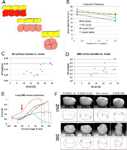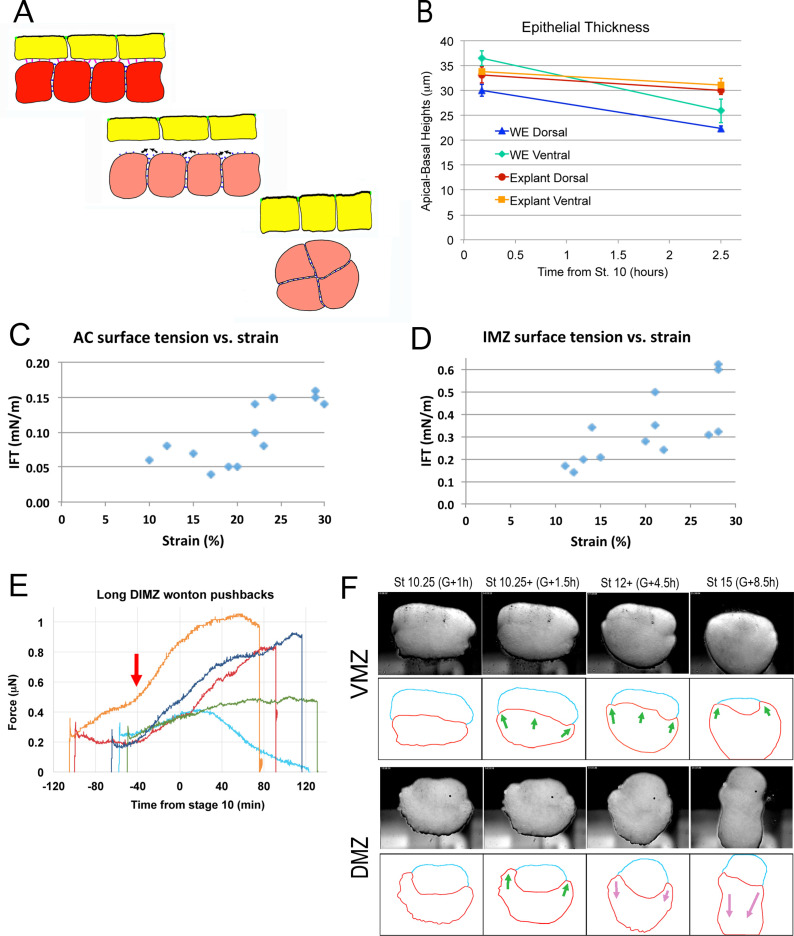 Figure 5-Figure Supplement 2. Test of epithelial thickness; test of surface tension vs. strain; test of IMZ pushback; behavior of deep IMZ plus NIMZ tissue explants. (A) Model for the development of IFT between superficial (yellow) and deep layers (red-ish) of the IMZ; prior to Stage 10- (top), the superficial epithelium and deep tissue have high affinity for each other, so low IFT; beginning at Stage 10-, affinity decreases (middle), increasing IFT and leading the deep tissue to round up (bottom). One possibility is that the epithelium columnarizes (Bottom, yellow cells), to match the new, lower surface area of the deep tissue. (B) Thickness of the non-bottle cell epithelium of the IMZ in both whole embryos (WE) and explants declines during the first two hours of gastrulation (based on RDA-labeled explants and embryos as showing in Figure 3âfigure supplement 1A,B, 2 A). The IFT of small sandwiches of both AC (C) and IMZ (D) over a range of strains. (E) DIMZ wontons held under the MicroSquisher platen, initially at 0.3 μN, develop additional compression force over three hours (e.g. Video 15*, on which the dark blue line is based). The mean time of force increase, G-41m, is indicated (red arrow). (F) Explants of about 90° of deep ventral and dorsal upper IMZ plus NIMZ tissue (VMZ and DMZ) under a cover glass (upper panels). The upper IMZ (red outline in lower panels) begins to engulf the NIMZ (blue outline) in both VMZ and DMZ explants (green arrows), but at Stage 10.5, IMZ in the DMZ explant reverses course and begins to converge and extend (magenta arrows; Video 16*, 21*; see also Video 17*). |