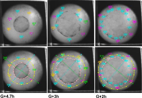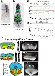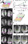 Figure 6-Figure Supplement 2. Examples of tracking of IMZ and blastopore area through the course of a time lapse movie using fiduciary points. Points initially laying at the blastopore lip at late time points (~G + 8 h) are tracked backward to early gastrula stages (top row, outer points). Once bottle cells apices are revealed, the vegetal edge of the bottle field is also tracked backwards (top row, inner circle of blue points). At each time point, the blastoporal area (or prospective blastoporal area, at earlier stages) is determined (area inside pink line), as is the area inside the upper boundary of the IMZ (yellow line â a bit below the actual limit of involution). Areas are determined based on the spherical area of the embryo occupied by each region (see Materials and methods). IMZ area is determined as the area inside the upper IMZ boundary minus the blastoporal area ( = area inside the lower IMZ boundary). Areas are normalized to starting area for each embryo. The embryo shown is a ventralized embryo. |