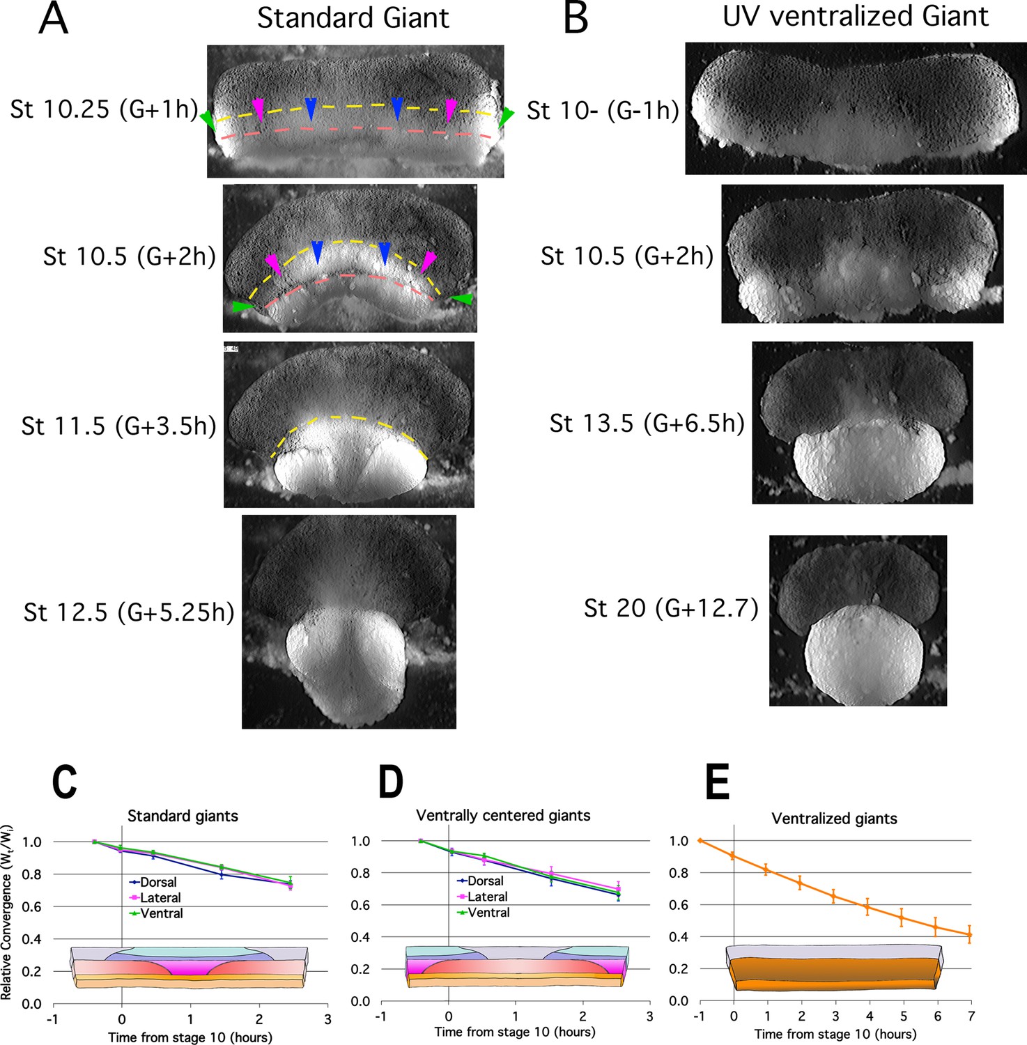 Figure 2. Early Convergence is uniform across regions. Frames from time lapse movies of standard giant sandwich explants (A; Video 2*, left) or ventralized standard giants (B; Video 3*) after release from their constraining coverslips show uniform convergence of the IMZ. The upper limits of the upper and lower IMZ are indicated by dashed yellow and pink lines, respectively (A). To compare regional rates of convergence in such explants, the mediolateral extent of the dorsal (A, between blue pointers), lateral (between blue and magenta pointers), and ventral regions (between magenta and green pointers) of the IMZ were measured at times from Stage 10- and plotted with respect to initial width (Wt/Wi) in standard (dorsally centered) giants (n = 3â5 embryos per time point) (C) and ventrally centered giants (n = 4â5 embryos) (D). The convergence of the entire IMZ was also measured in giants from ventralized embryos (n = 3 embryos) (E); error bars = SEM. For C-E, the same explants were measured at sequential time points. |