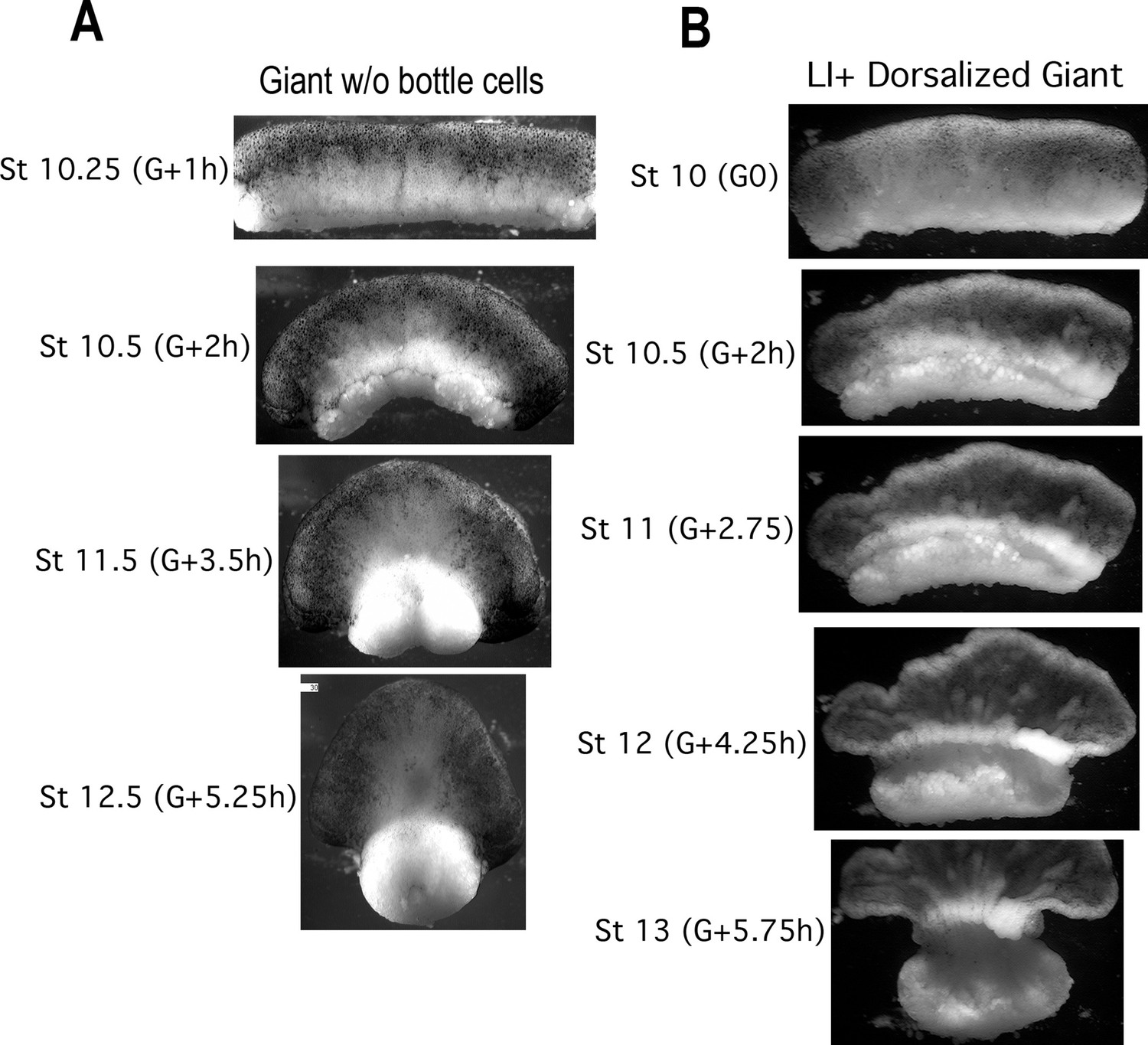 Figure 2-Figure Supplement 1. CT in giants without bottle cells and in Li+ Dorsoanteriorized giant sandwich explants. Giants made without bottle cells (A, Video 2, right) also show isotropic convergence and thickening of the IMZ throughout gastrulation in control embryos (stages and hours from the onset of gastrulation (G + Xh) indicated). Giants made from dorsoanteriorized embryos (B, Video 5) show isotropic convergence and thickening of the IMZ through at least Stage 10.5, when they begin isotropic convergence driving anterior-posterior extension; a thickened mass remains in the more animal portion of the IMZ and feeds into the converging and extending tissue. |