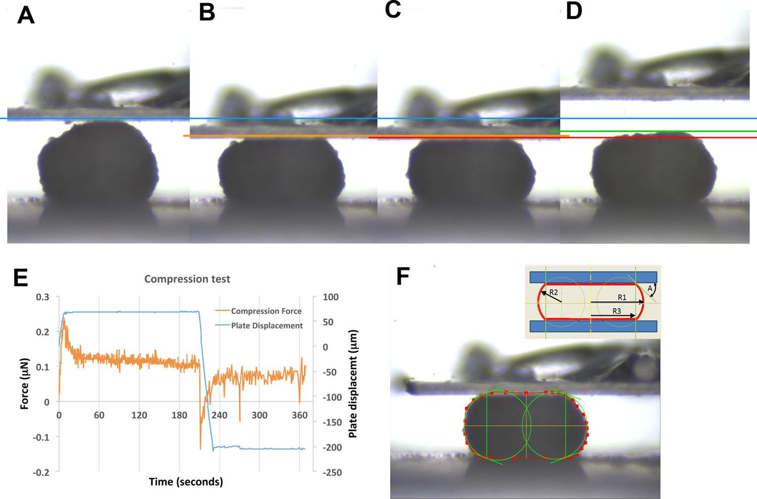 Figure 5-Figure Supplement 1. Example of parallel plate compression test. Frames taken at 0, 10, 180, and 220 seconds (A, B, C, D, respectively). Blue line marks the top of the explant prior to compression (0 s, A). Orange line marks top of explant after initial compression is applied (10 s, B). Red line marks top of explant after 180 s of stress relaxation (C). Green line marks top of explant 10 s after plate is lifted off explant (220 s, D). Compression is applied to 20% strain over the first 10 s, then stabilized for an additional 10 s, after which active plate movement stops and the explant is allowed to undergo stress relaxation (E). The shape of the explant profile is measured at 180 s (F), giving the radii of curvature and the angle between explant and plate (F – inset; R1–R3, A); these are used to give the surface tension (see Materials and methods). Figure 5—figure supplement 1F inset is reproduced from image from CellScale MicroTester software, with permission from CellScale. |